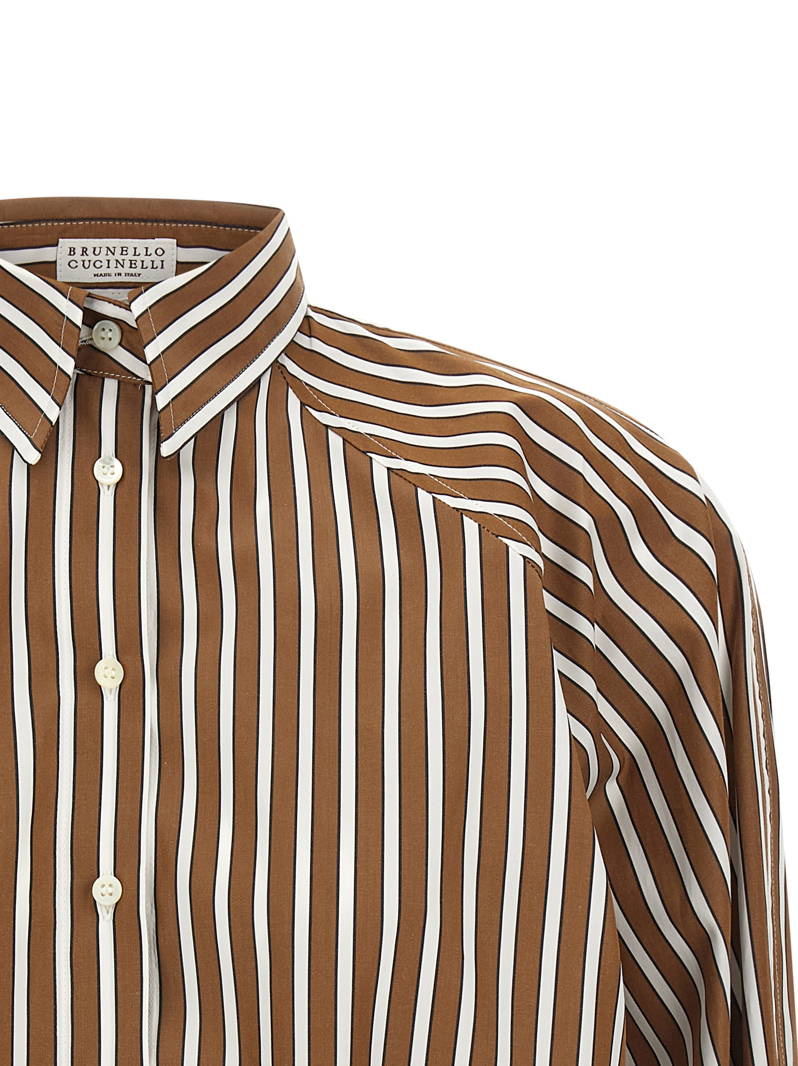 Рубашка из полосатого хлопкового поплина «Shadow», заостренный воротник с отделкой «Monile» на спине, застежка на перламутровые пуговицы спереди, рукава реглан 3/4 с легким эффектом «баллона» и манжетами, эластичный низ.Характеристики товара