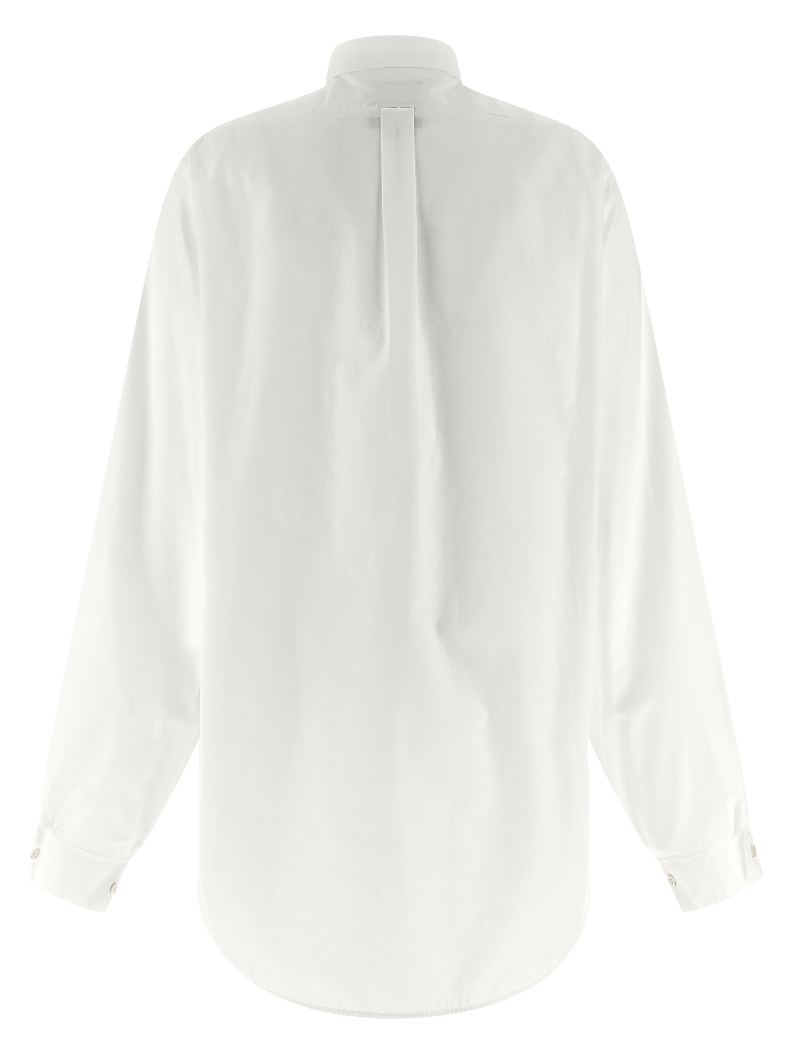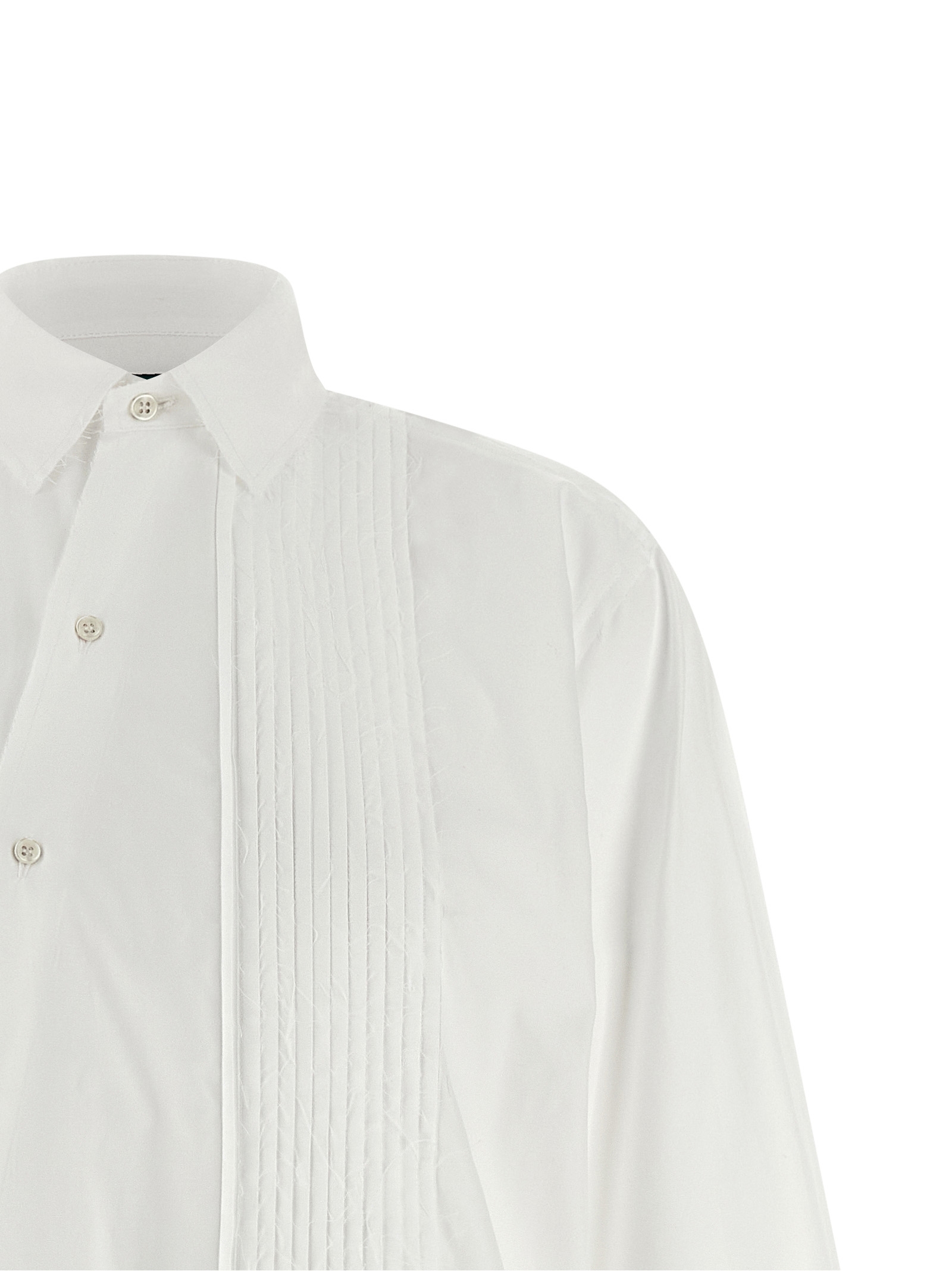 Мужская рубашка «Crazy smoking plissée» слегка свободного кроя, с «дымчатым» силуэтом, складками спереди, бахромой по складкам, застежкой на пуговицы спереди, заостренным воротником с необработанными краями, длинными рукавами с манжетами и пуговицами.