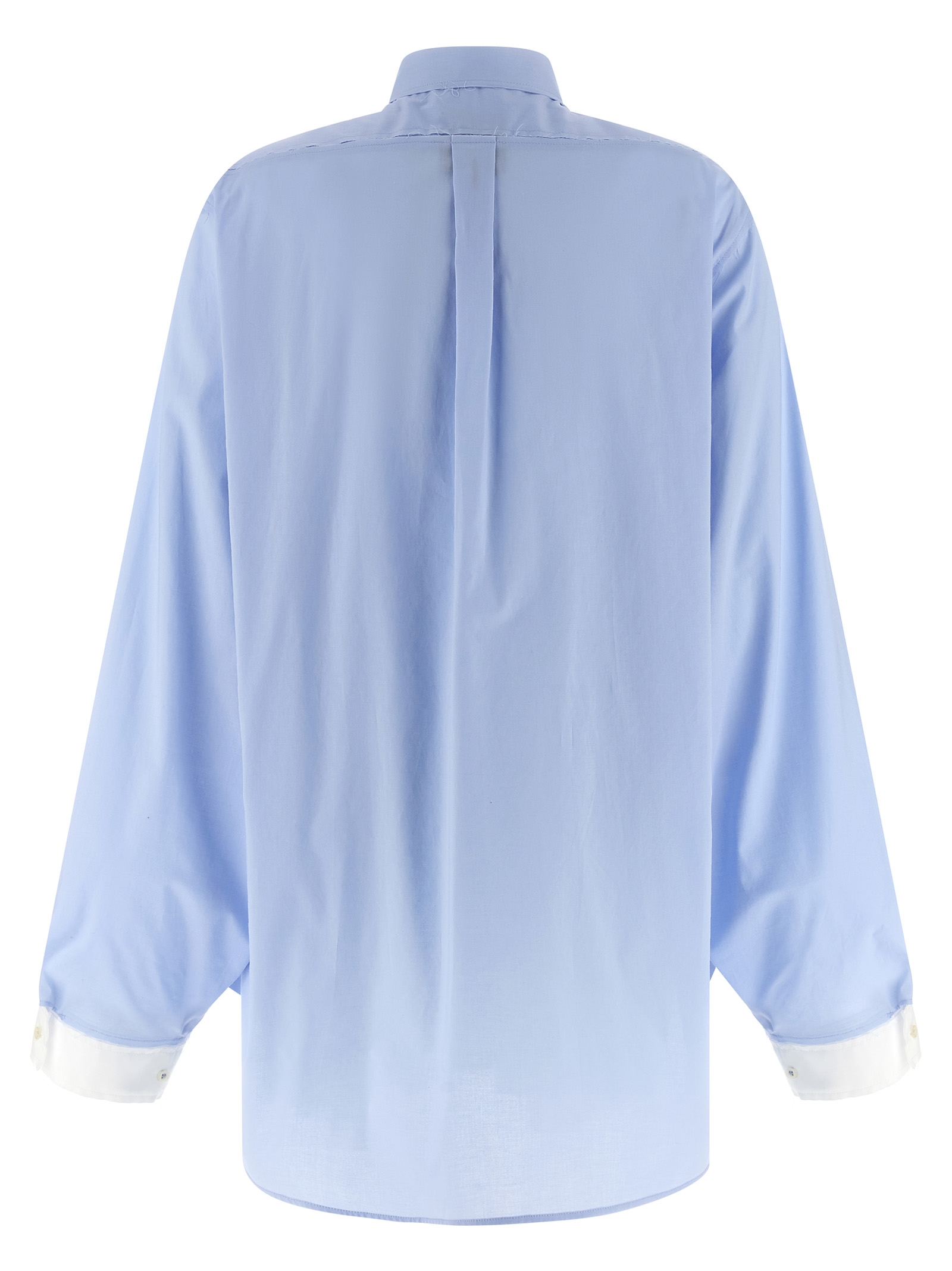 Мужская рубашка «Crazy smoking plissée» слегка свободного кроя, с «дымчатым» силуэтом, складками спереди, бахромой по складкам, застежкой на пуговицы спереди, заостренным воротником с необработанными краями, длинными рукавами с контрастными манжетами и пуговицами.