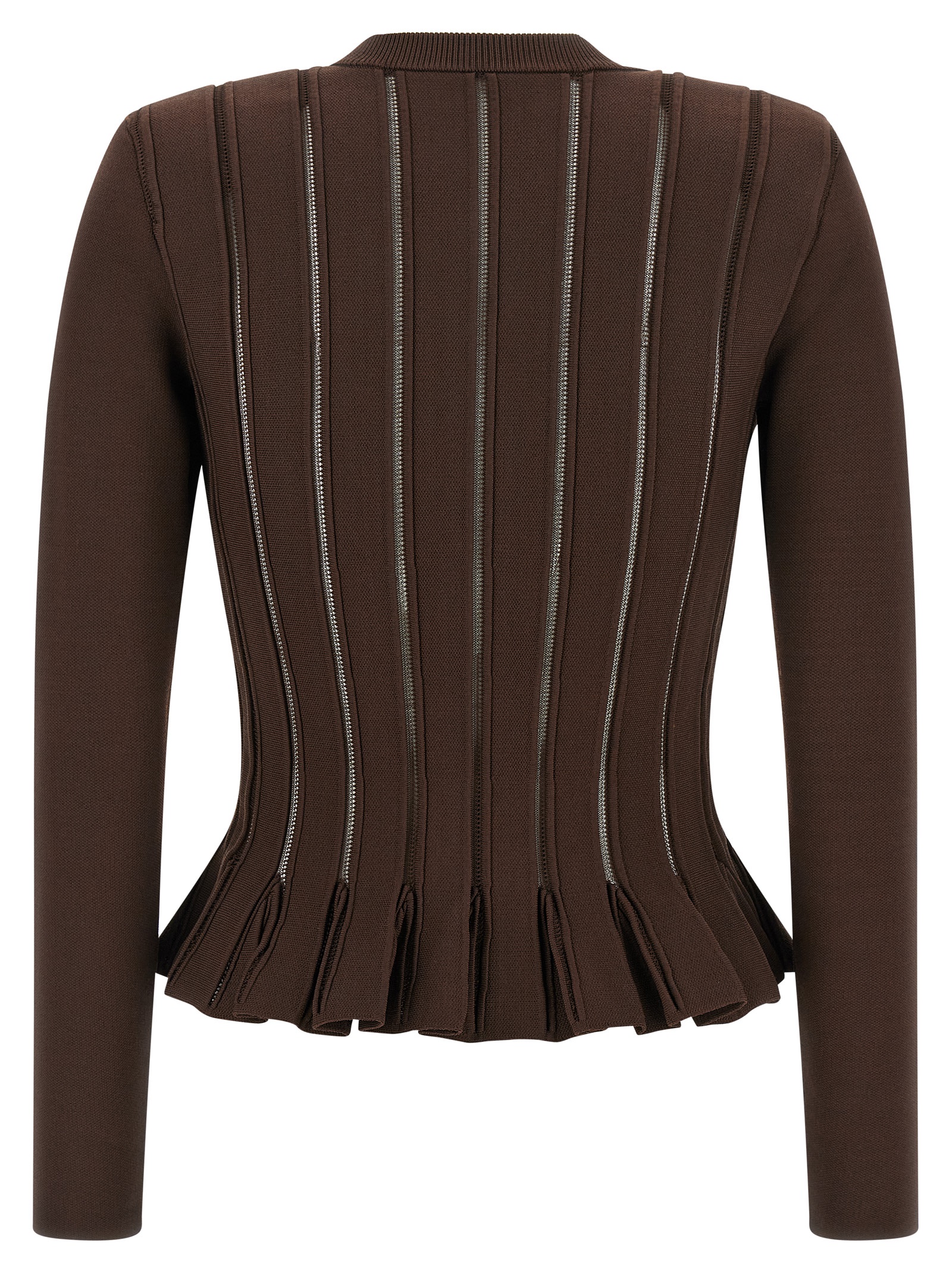 Knitted cardigan with band weave interspersed with embroidery à jour, crew neck, front button closure, long sleeves, flounced hem.Характеристики товара