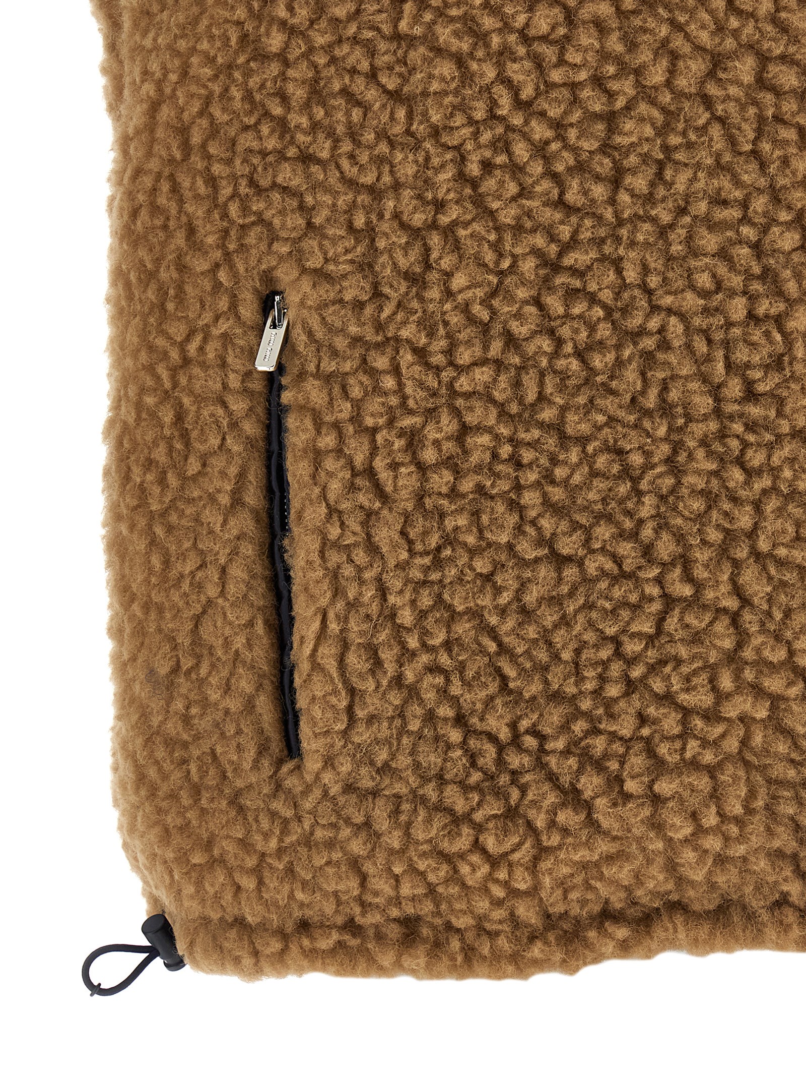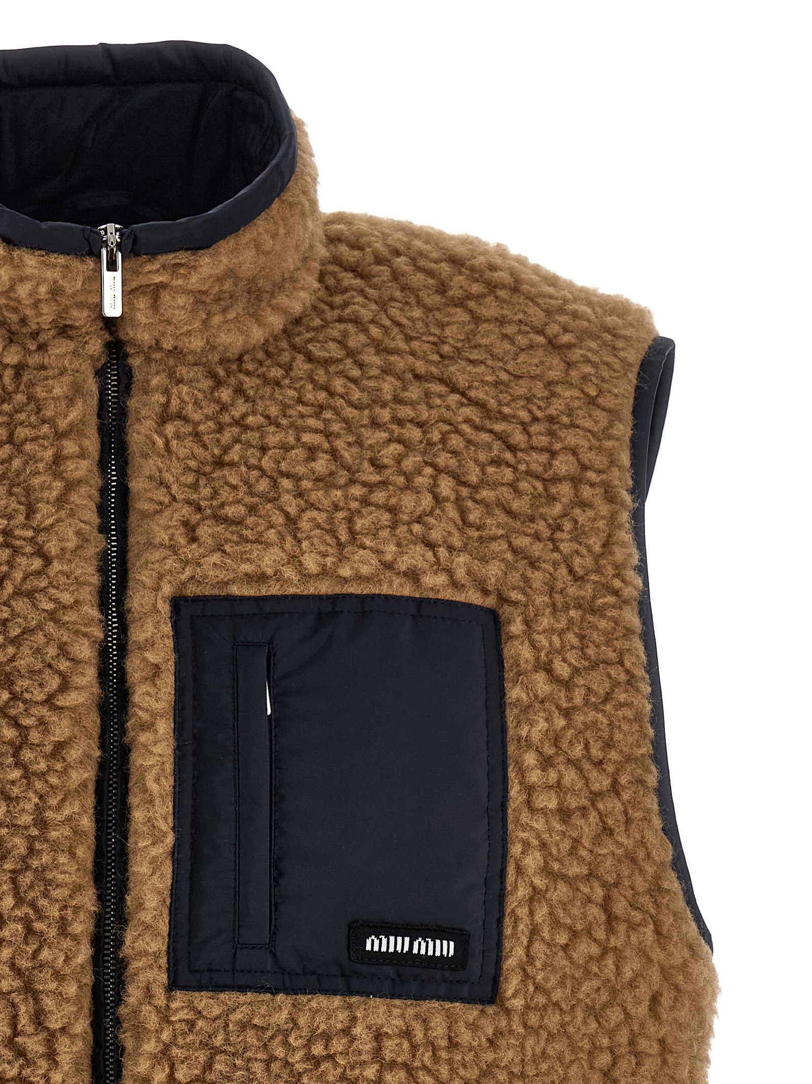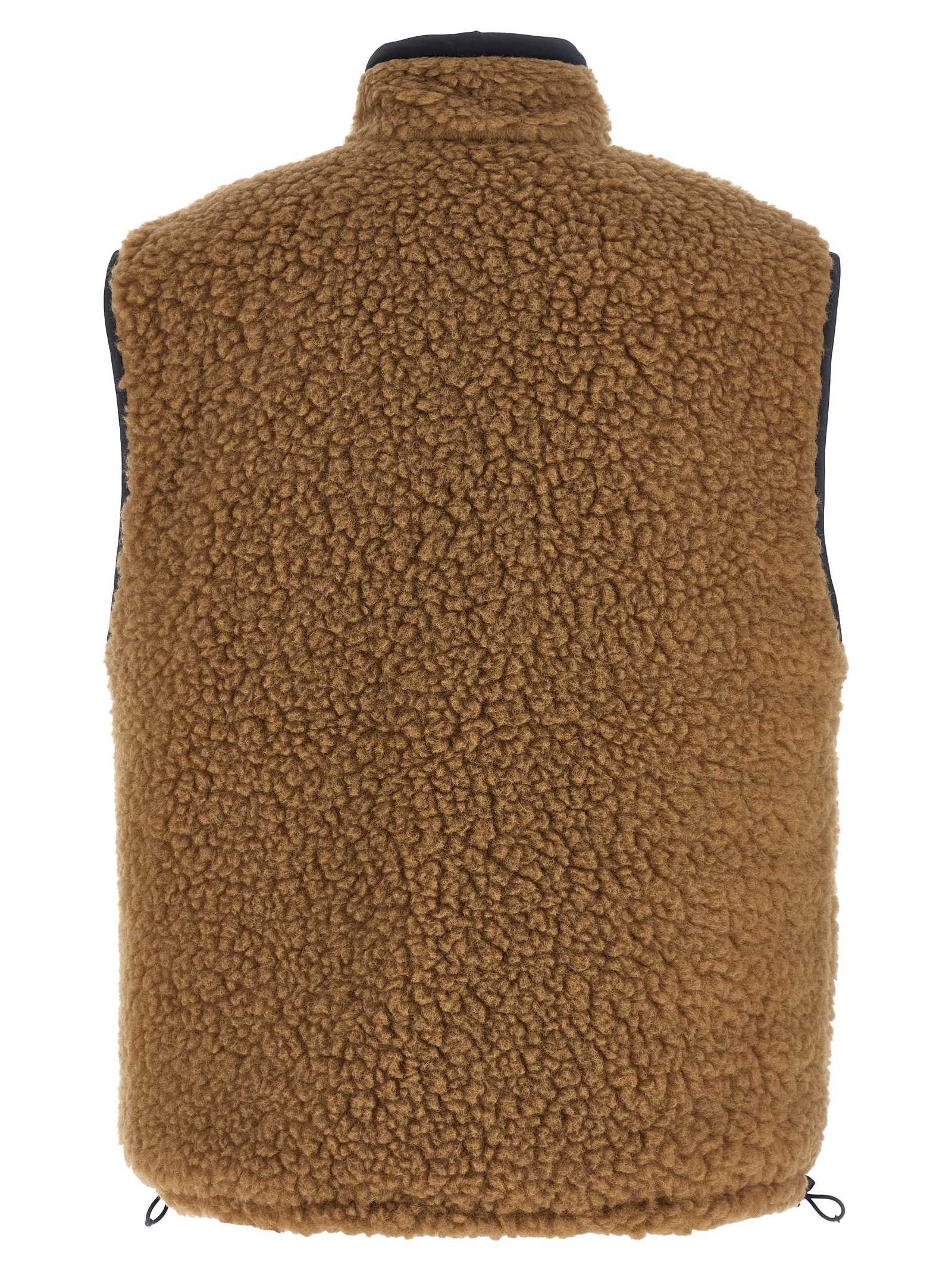Гибридный жилет с внешней частью из искусственного меха «тедди» и внутренней частью из материала «понже-тек» с легким наполнителем из гусиного пуха, воротником-стойкой, карманом из материала «понже-тек» с нашивкой с логотипом, карманами и шнурком по низу.