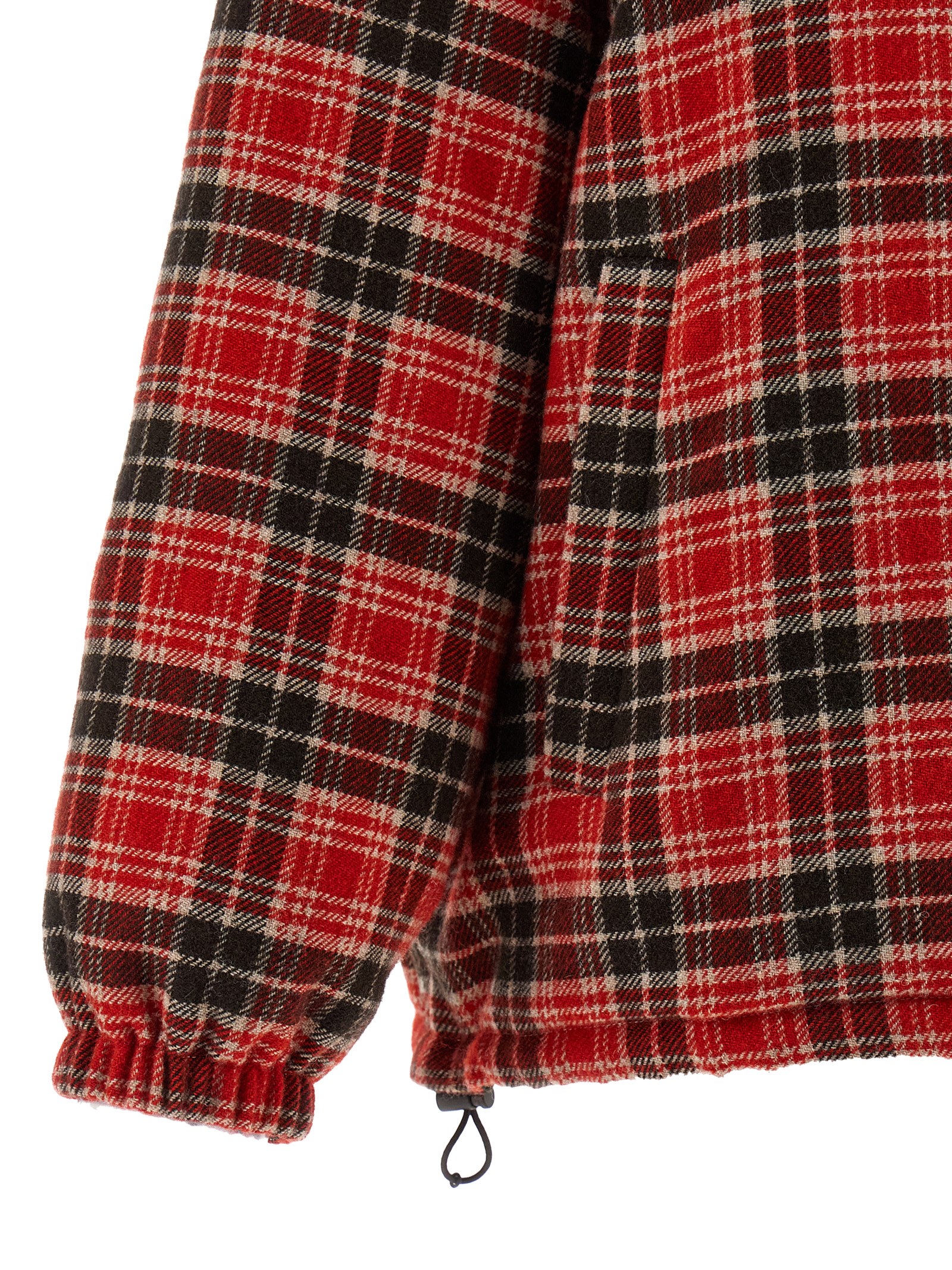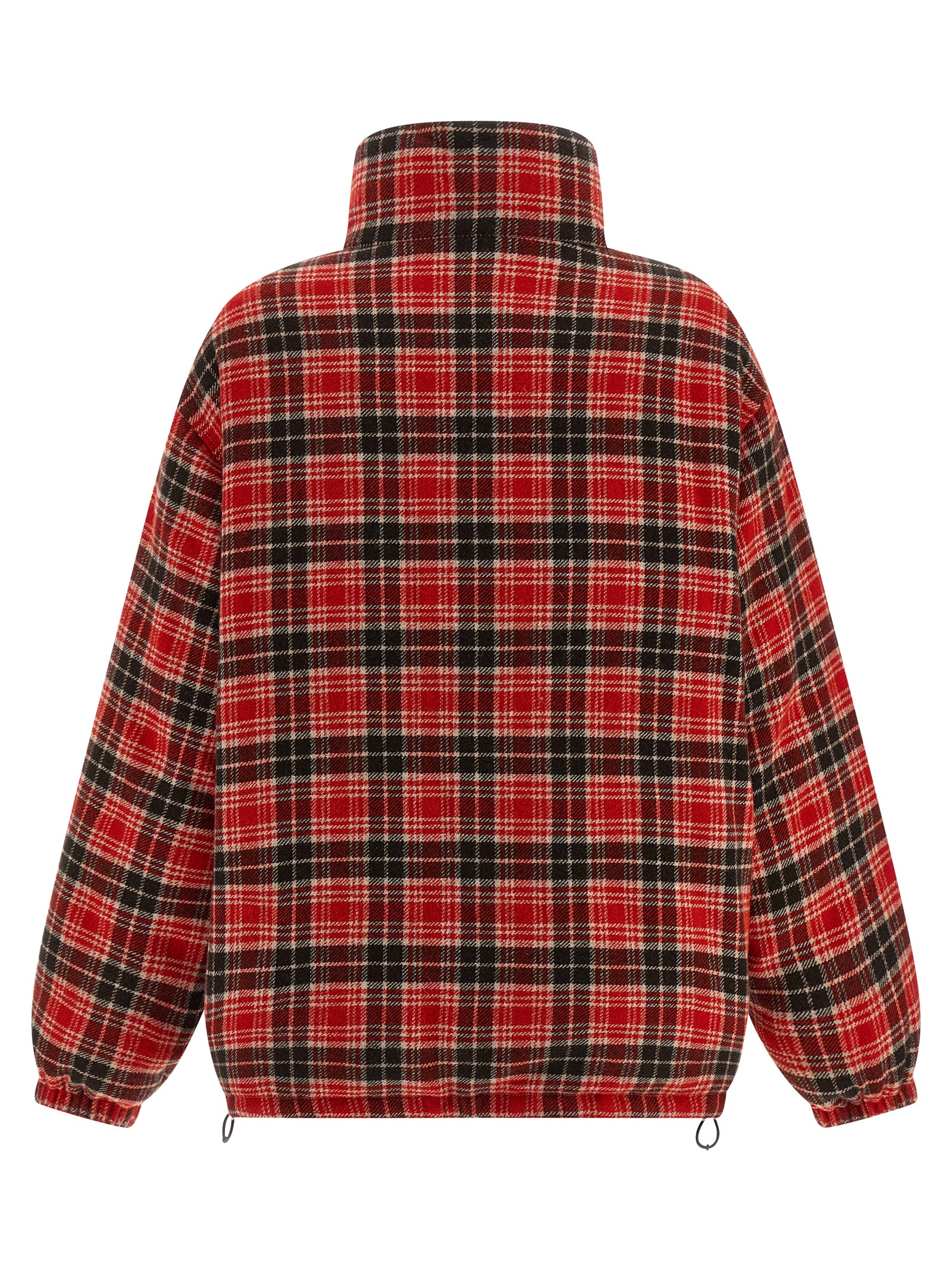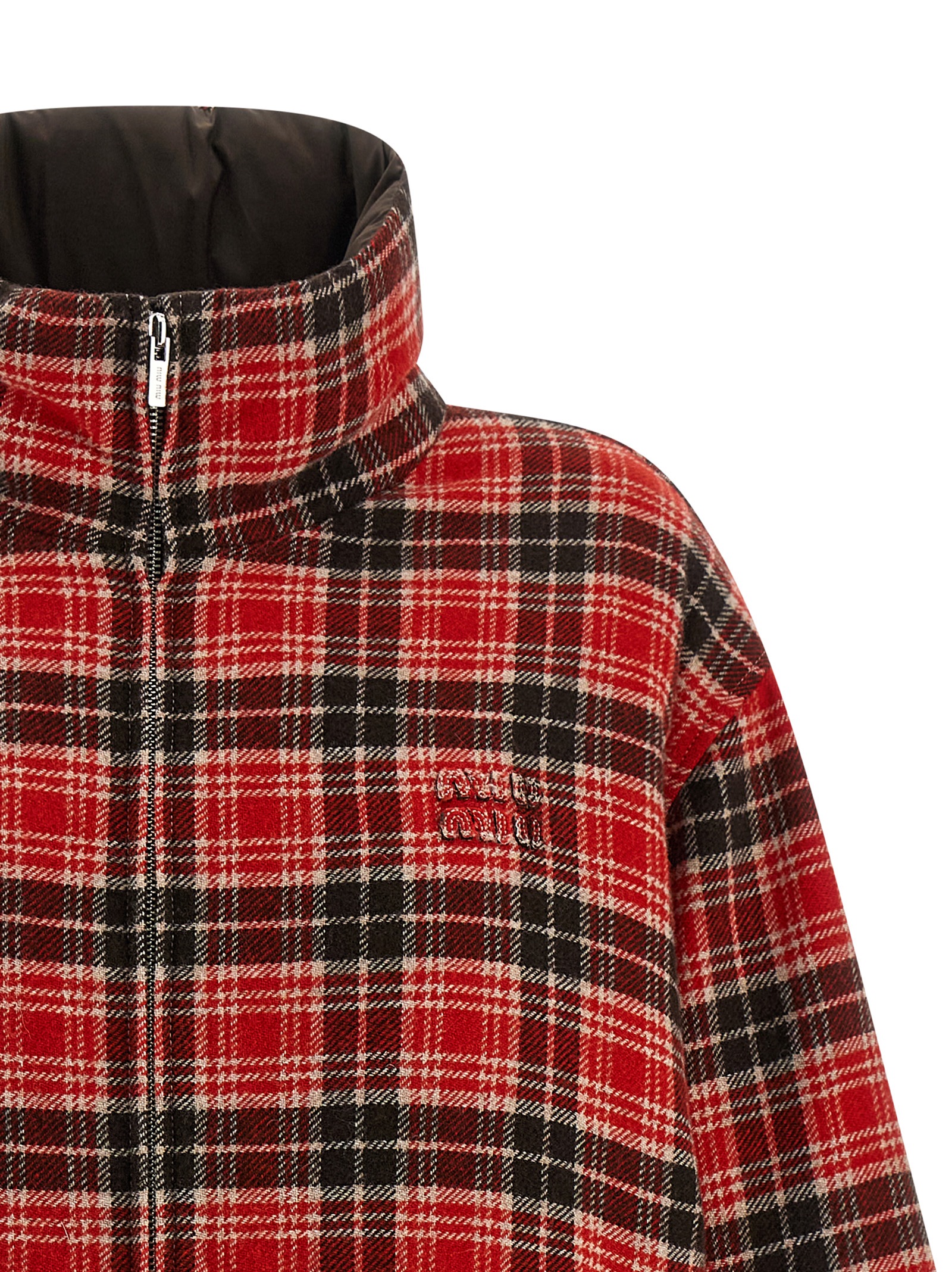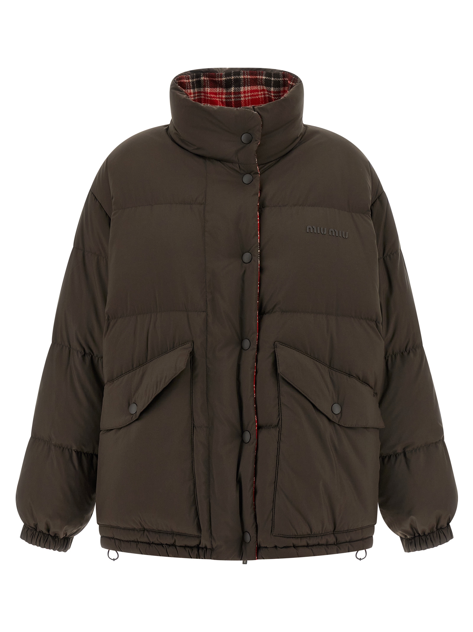 Двусторонняя пуховая куртка из однотонной ткани, стеганого понже, гусиного пуха и клетчатой ​​шерсти, воротник-стойка, нашивка с логотипом в тон на передней части, застежка на молнию и кнопки, карманы, длинные рукава со спущенными плечами и эластичными манжетами, шнурок по низу.