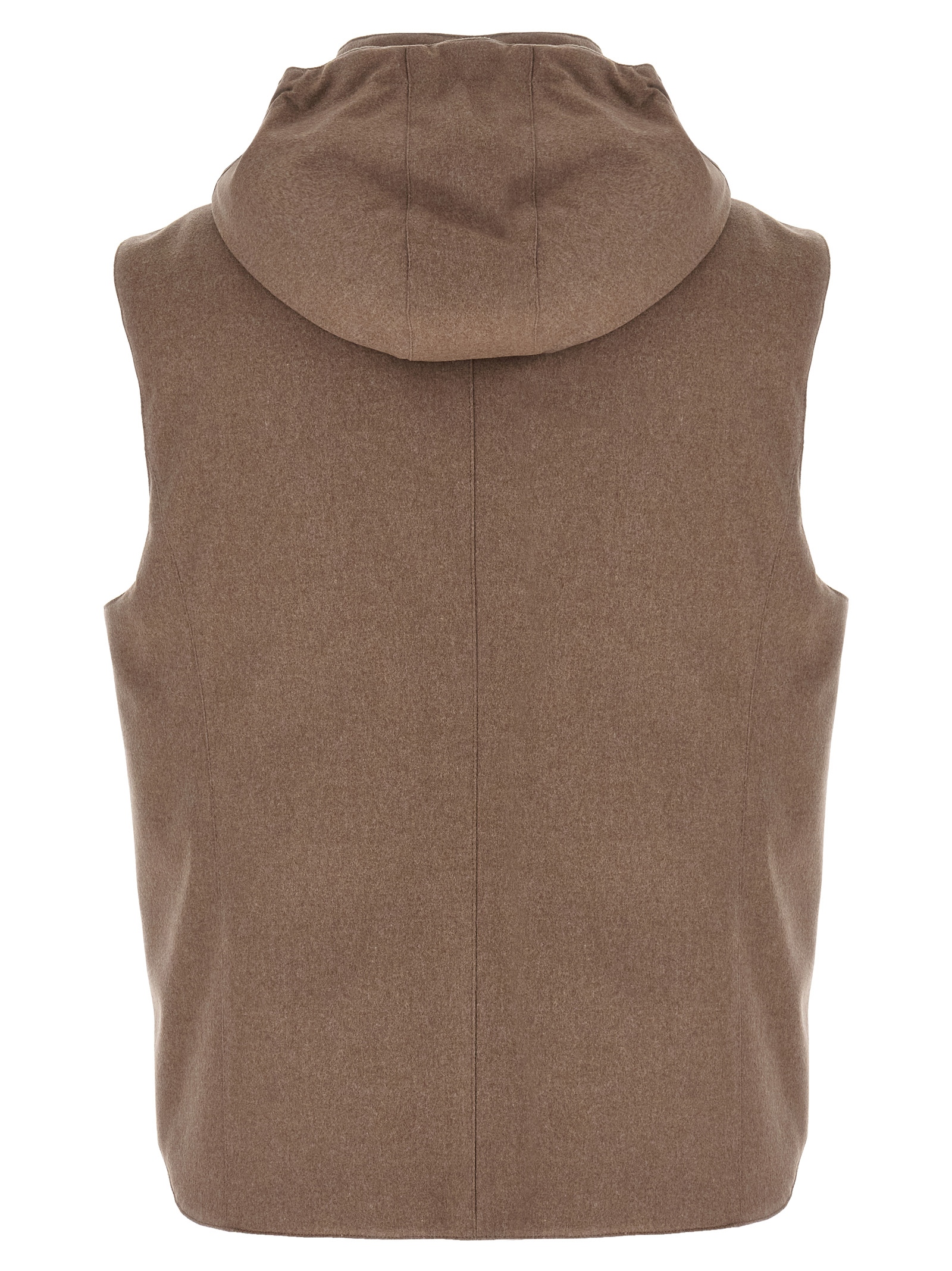 Water-repellent wool vest, quilted nylon lining with goose down padding, adjustable and removable hood, high neck, front snap button closure, pockets.