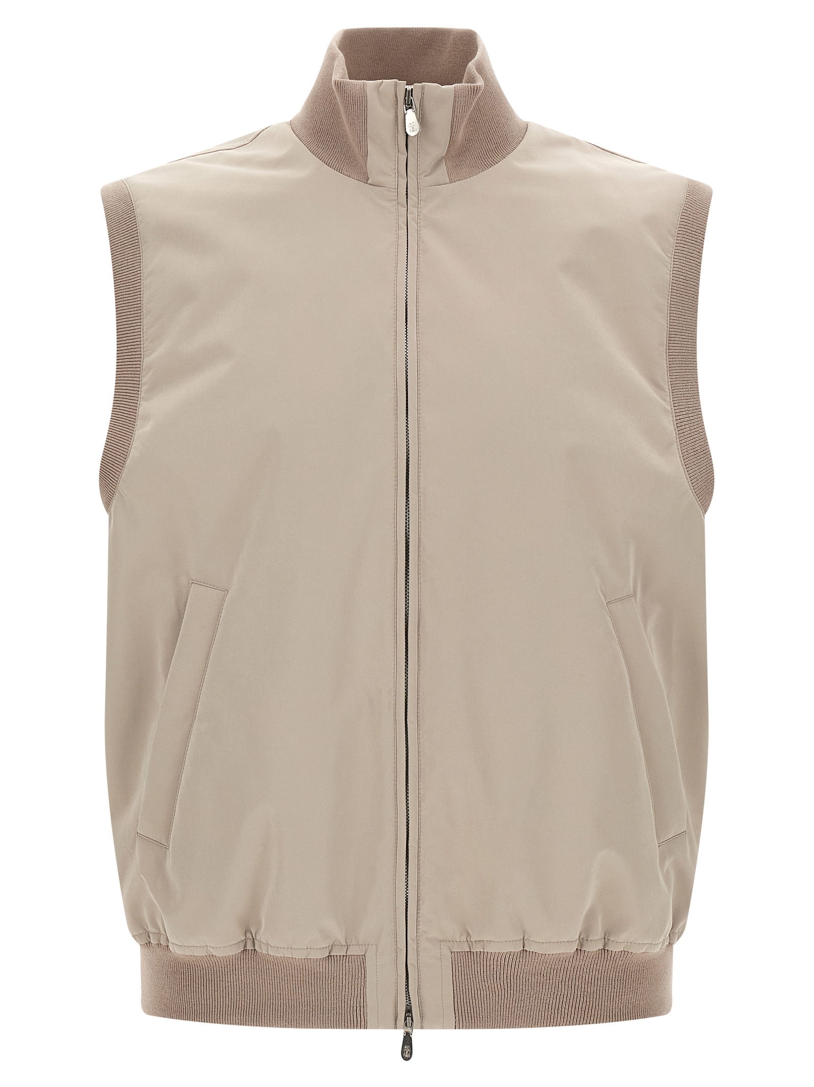Breathable and water-repellent membrane nylon vest with Thermore® padded with tone-on-tone ribbed knit details, water-repellent nylon lining, high neck, front zip closure, pockets, headband.