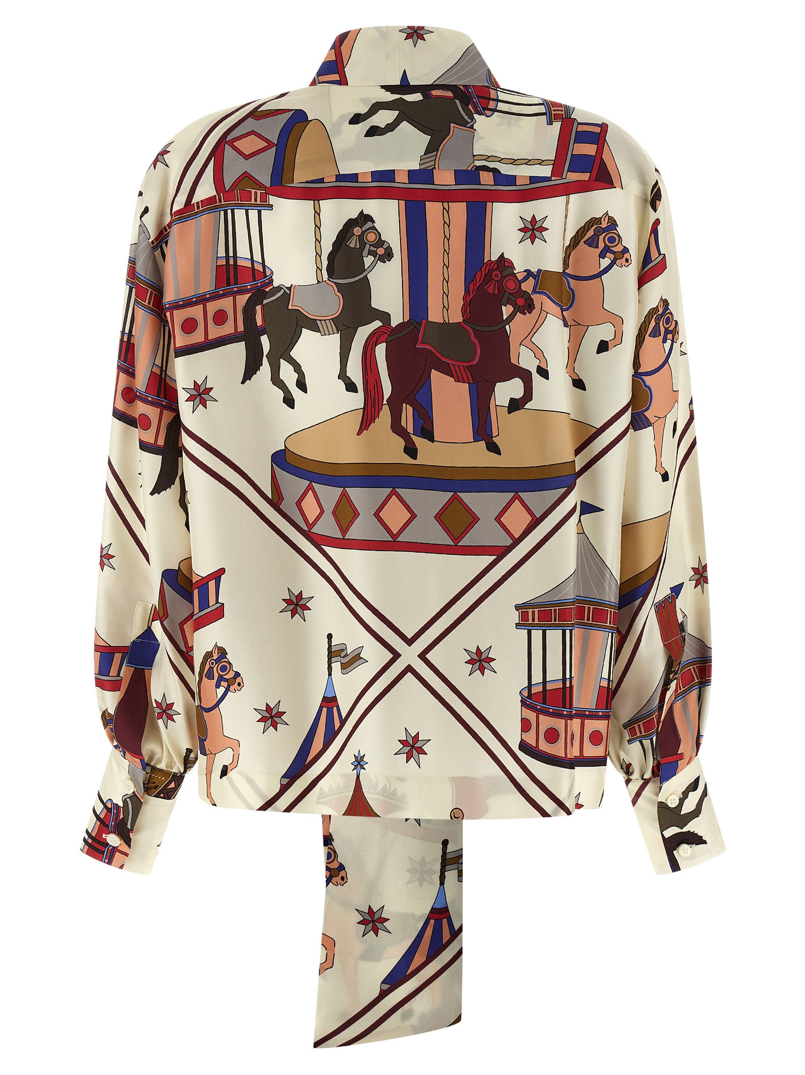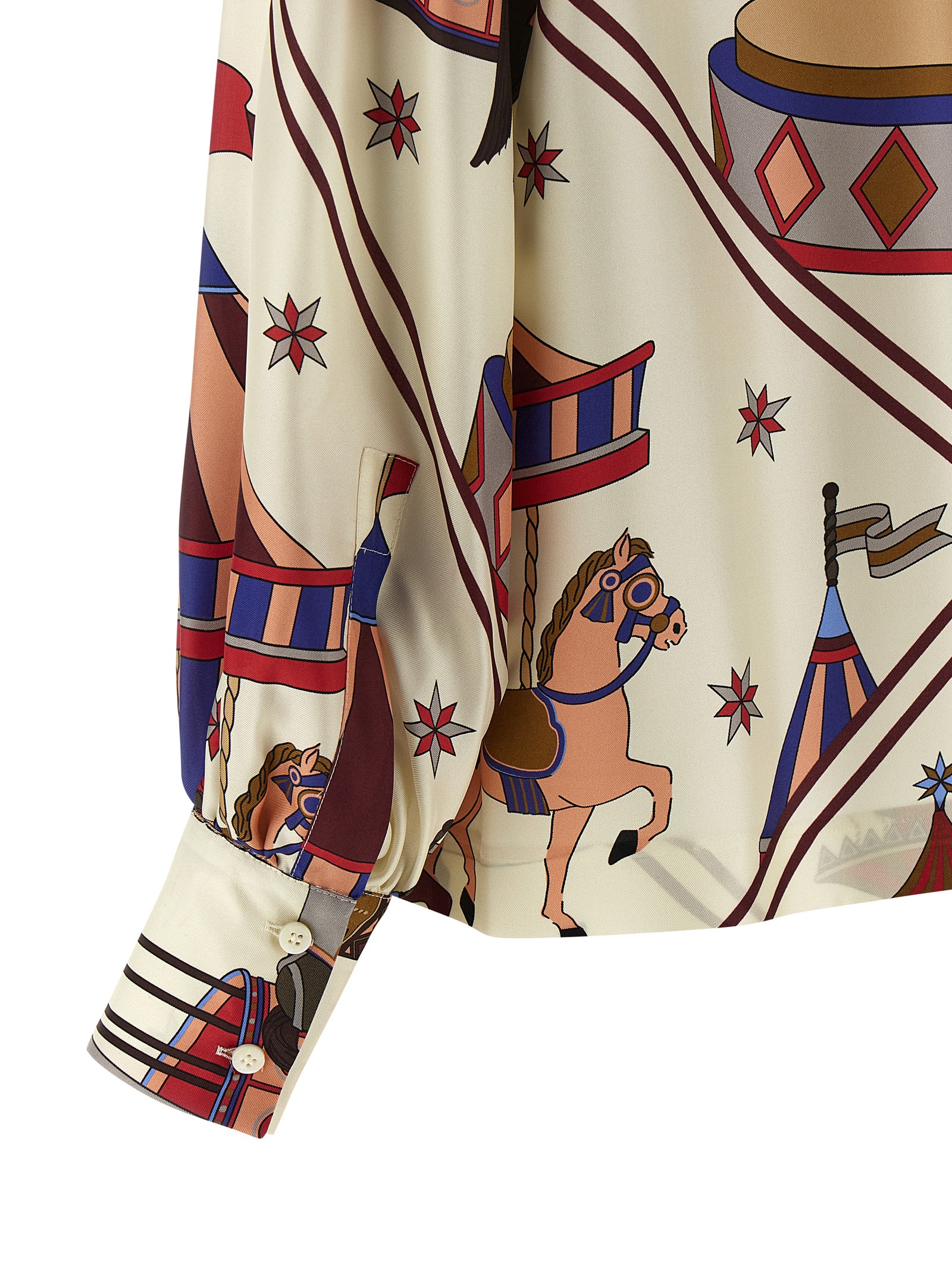 'Circo' print silk shirt, lavallière collar, long wide sleeves with cuffs.
