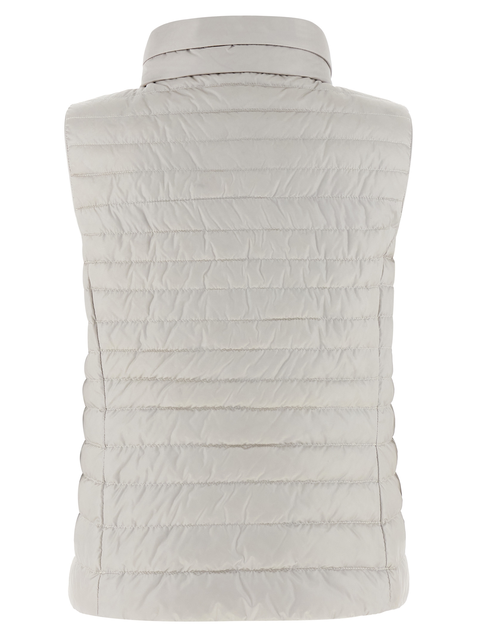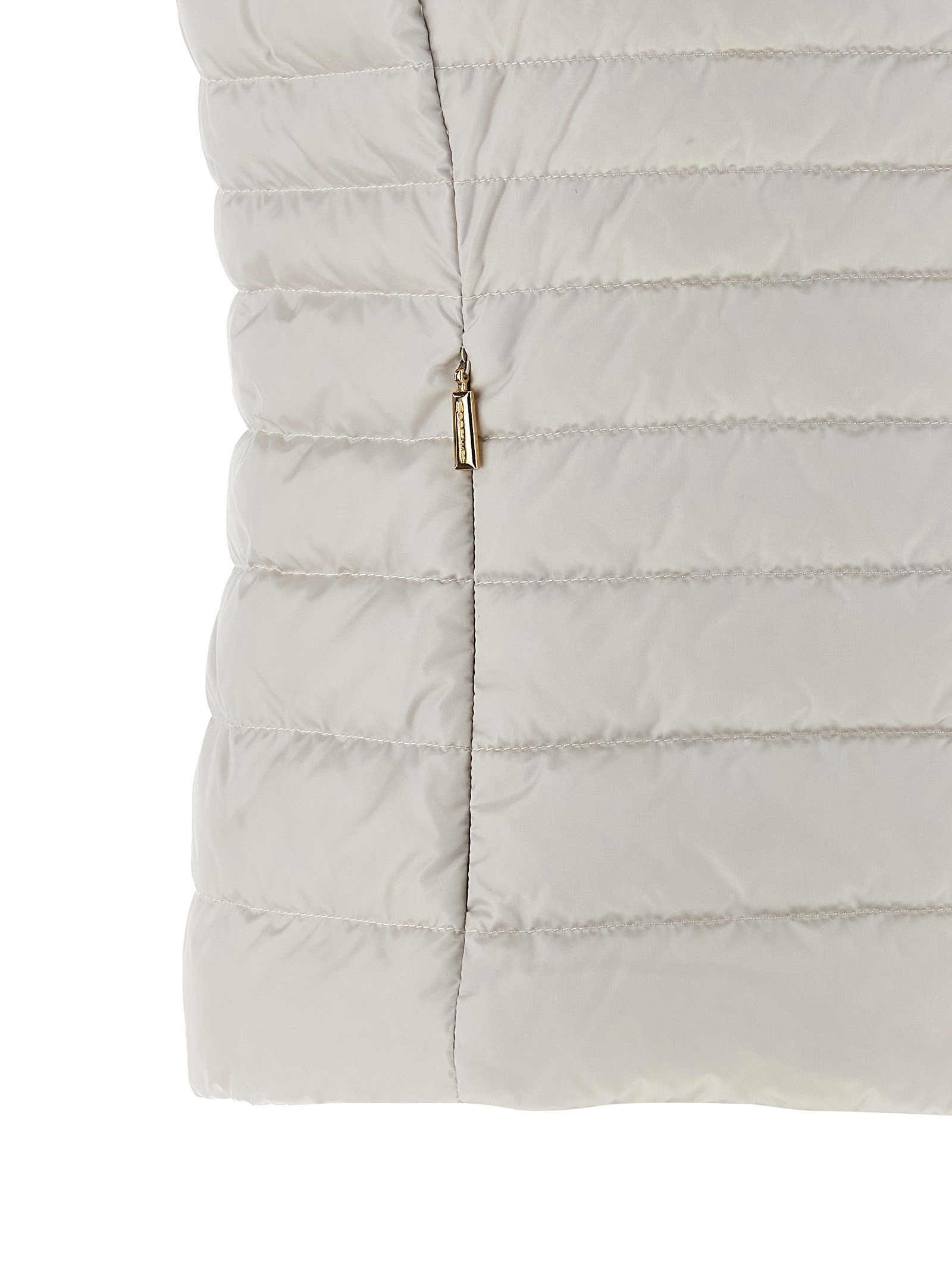 'Villan' vest in polished technical fabric quilted and goose feather padding, standing collar with removable hood, front zip closure, pockets.