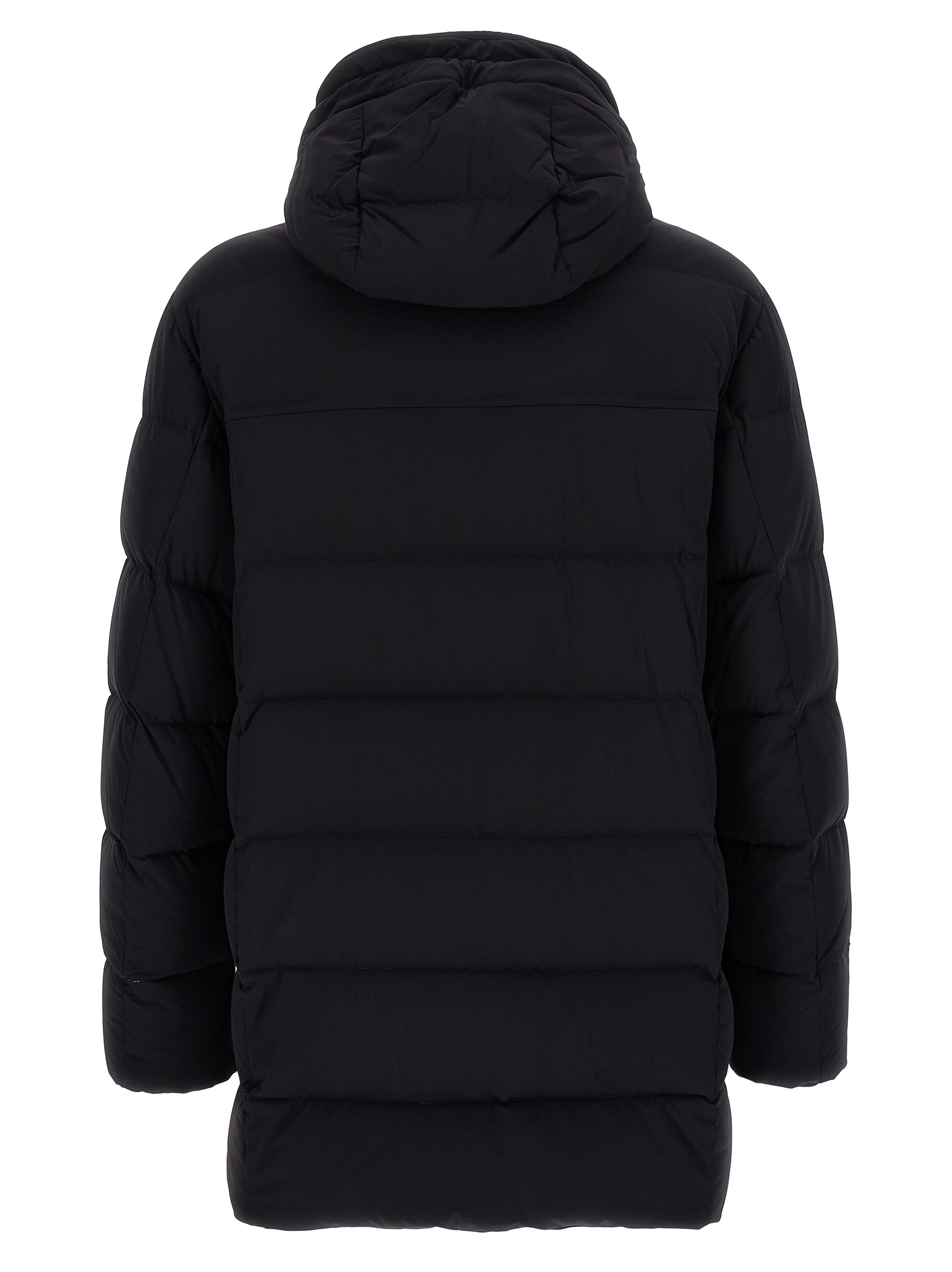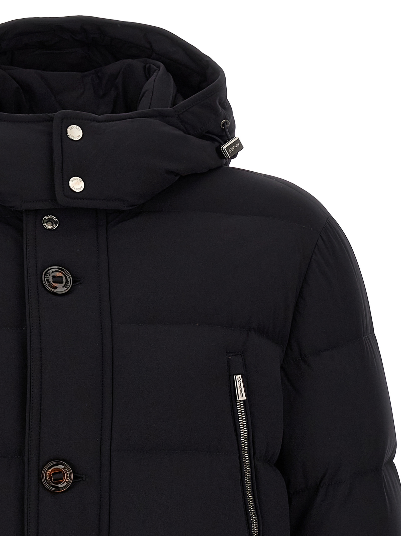 Long 'Gorner' down jacket in quilted water-repellent elastic fabric with goose down padding, removable hood with drawstring and snap button closure at the neck, high neck, front zip and button closure, pockets, long sleeves with knitted windproof cuffs. Coloring: very dark blue