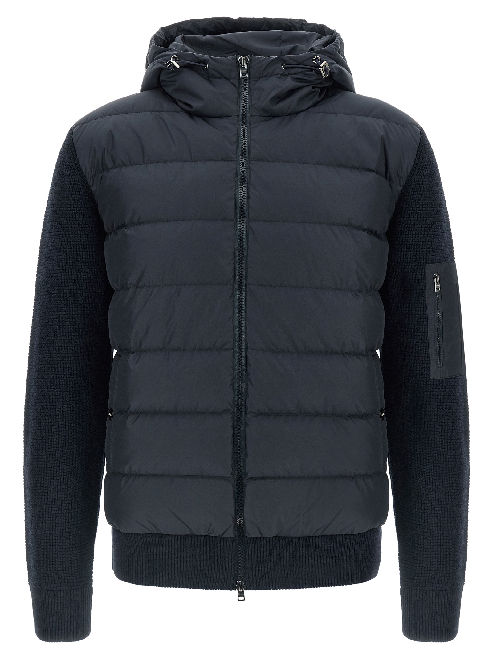 Two-material padded nylon and wool knit down jacket, hood, front zip closure, quilted closure, front pockets, long cuffed sleeves.
