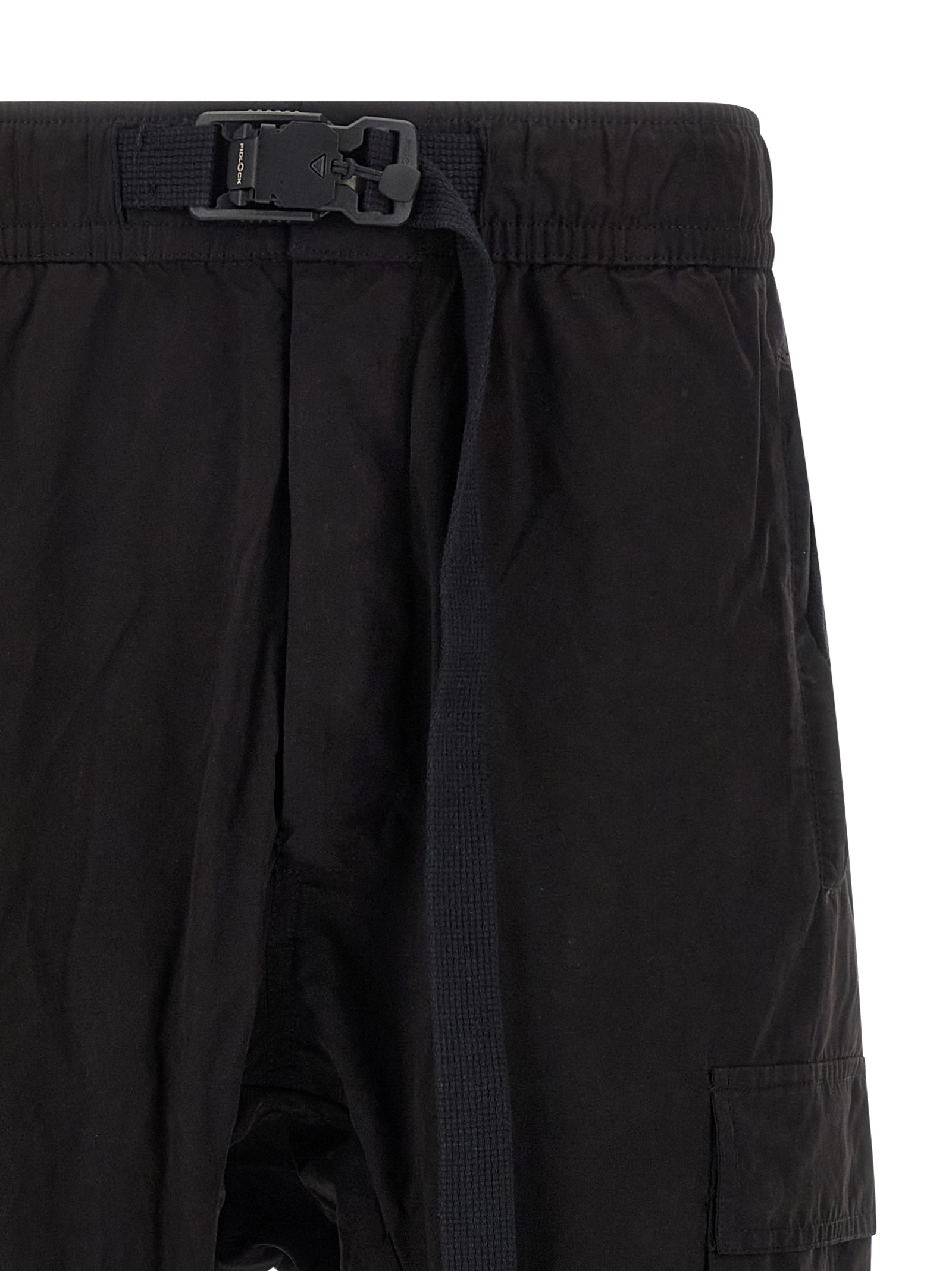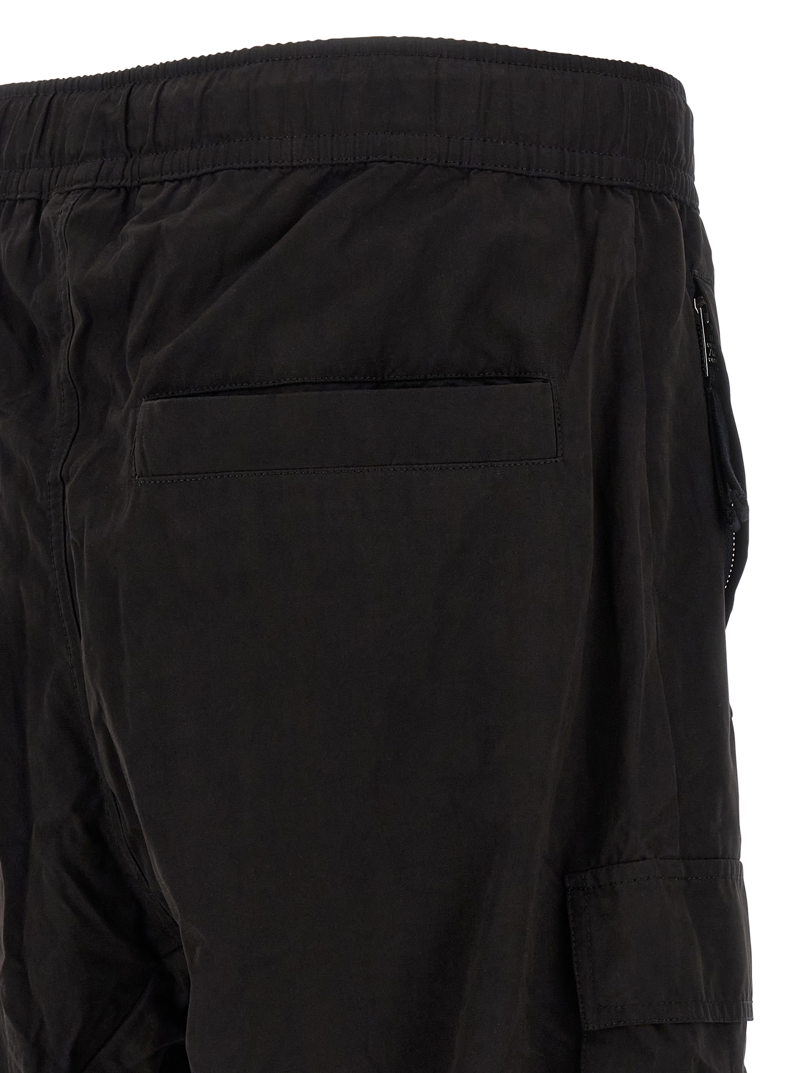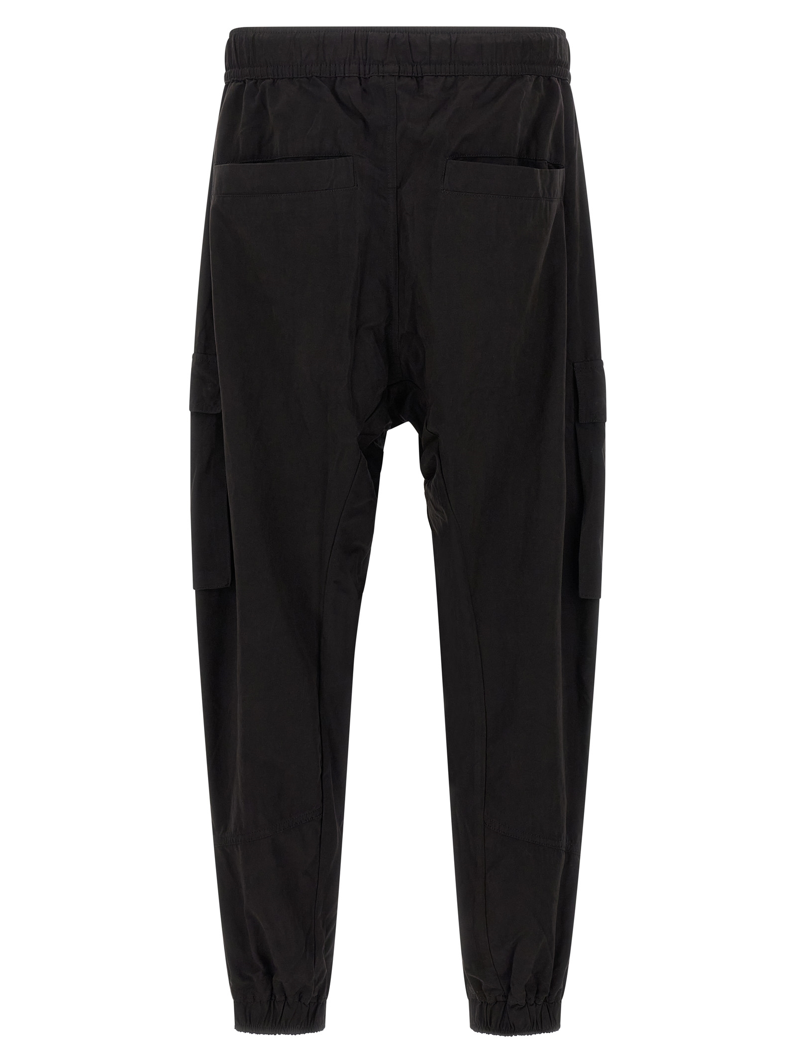 'M P 15' cargo pants in peached cotton blend with side pockets, low crotch, elastic waistband with integrated belt with cinch closure, flap with snap buttons, pockets, wide leg that tightens at the ankle with elastic cuffs.