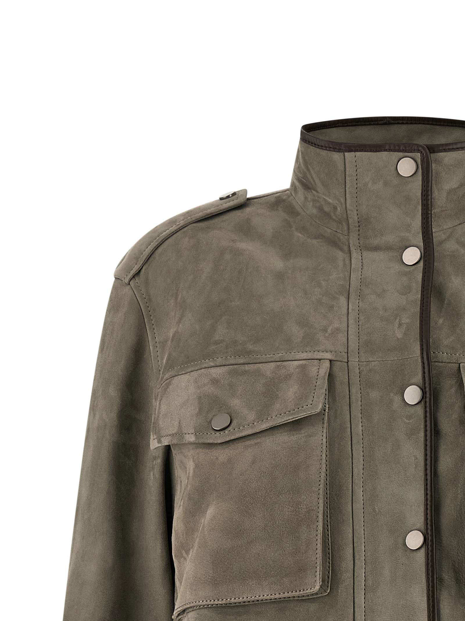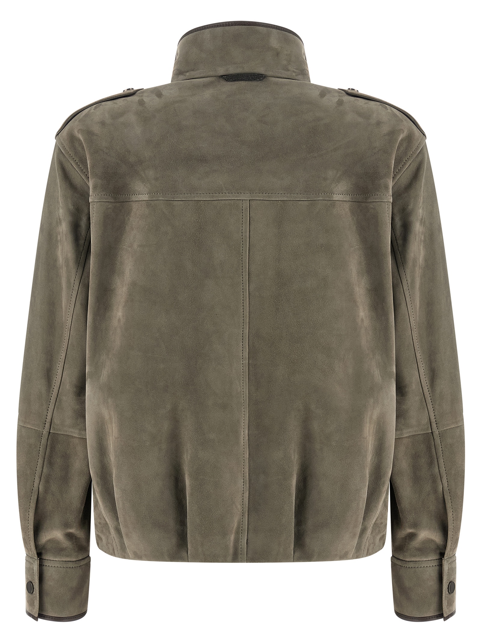 Couture suede jacket with contrasting smooth leather details, unlined, standing collar with Monile metal detail on the back, zip and snap button closure on the front, pockets, long cuffed sleeves, slightly curled hem.