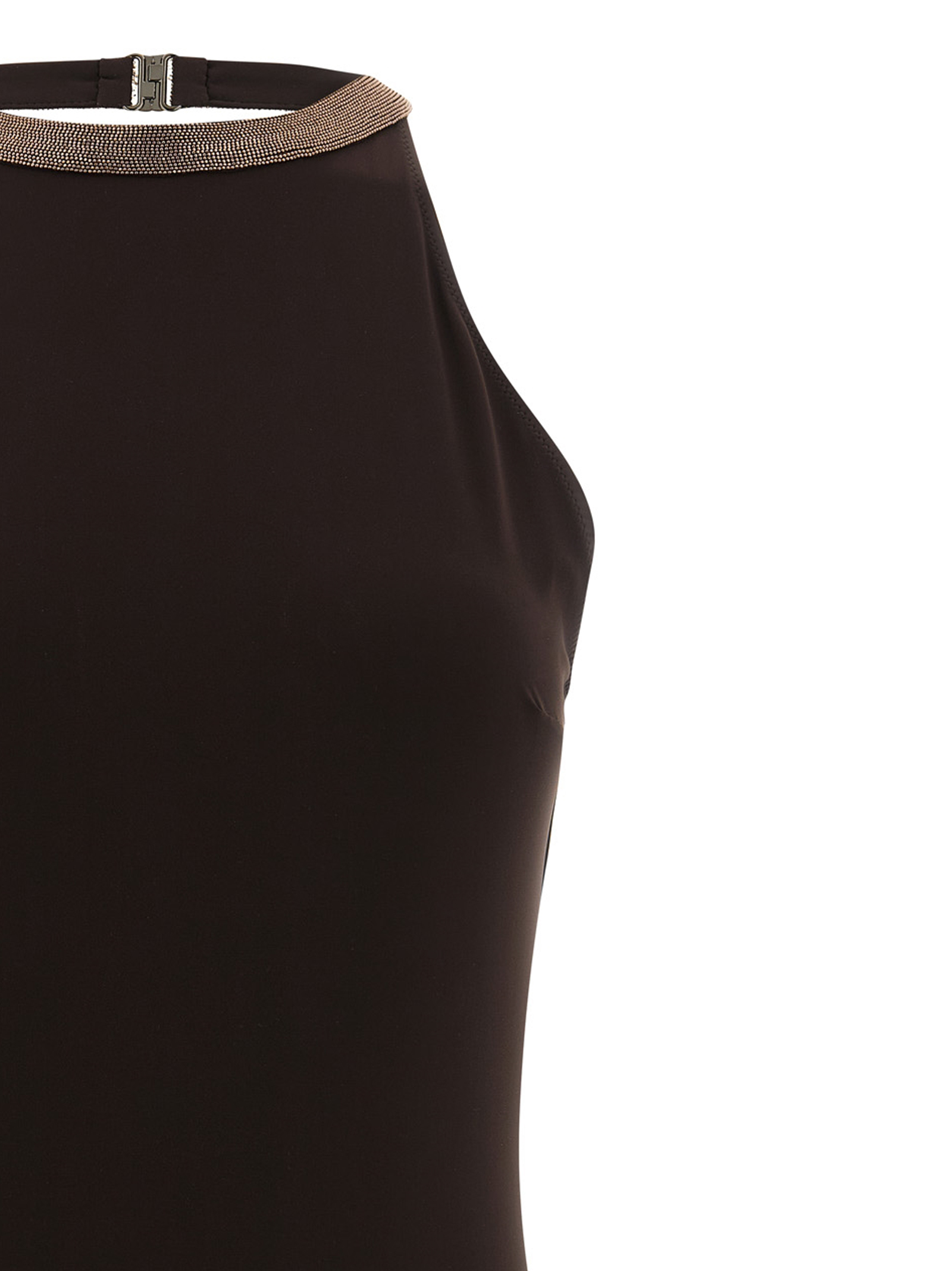 Слитный купальник из технологичного трикотажа, американский вырез горловины с воротником «Precious Collar» цвета «Monile» и застежкой на крючки сзади, глубокий круглый вырез на спине, классический дизайн.Характеристики товара