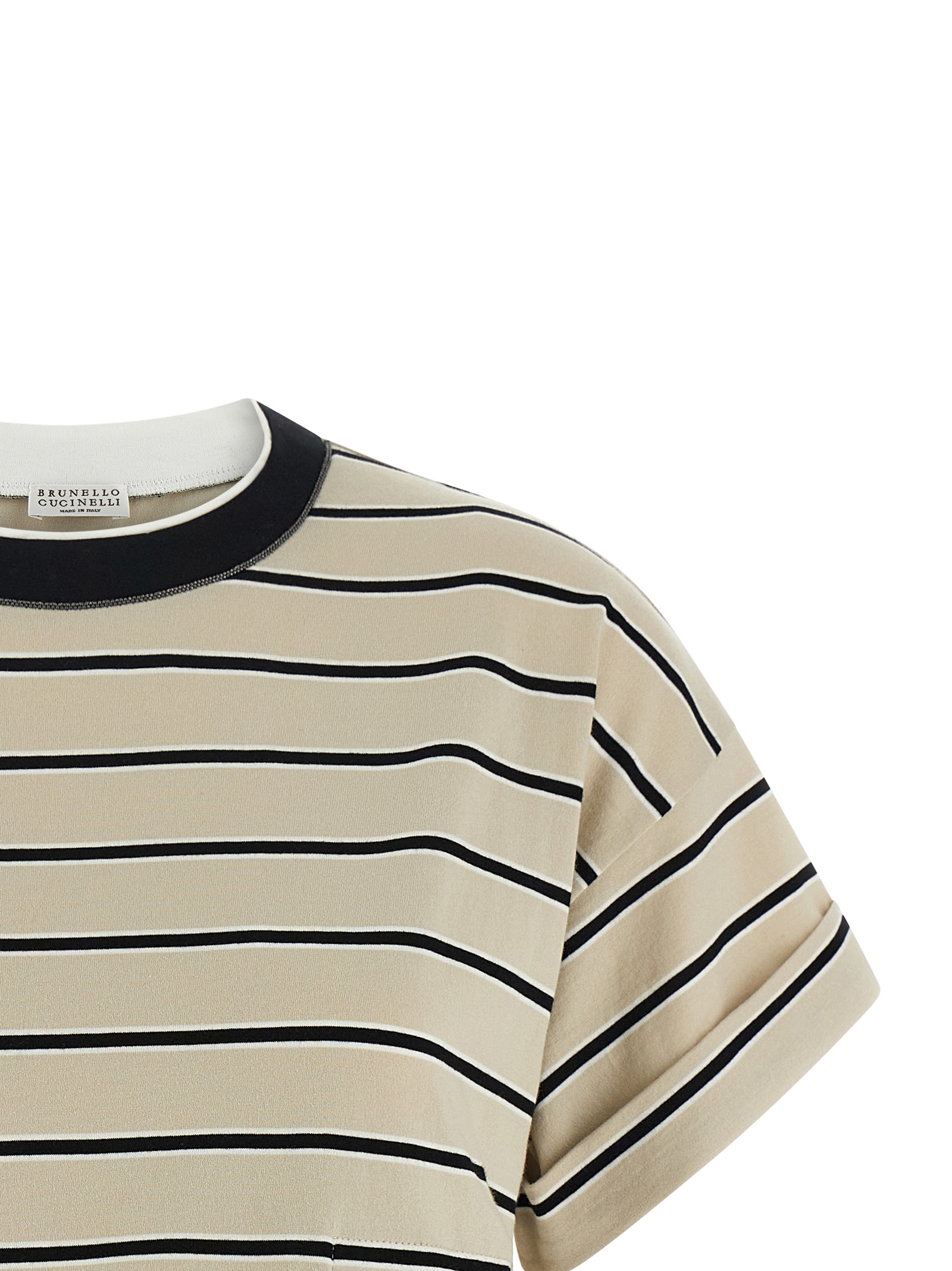 Striped cotton jersey T-shirt, double layer crew neck with slightly cropped Monile 'Shiny Trims' detail, short sleeves with turn-up on the cuffs, pockets
