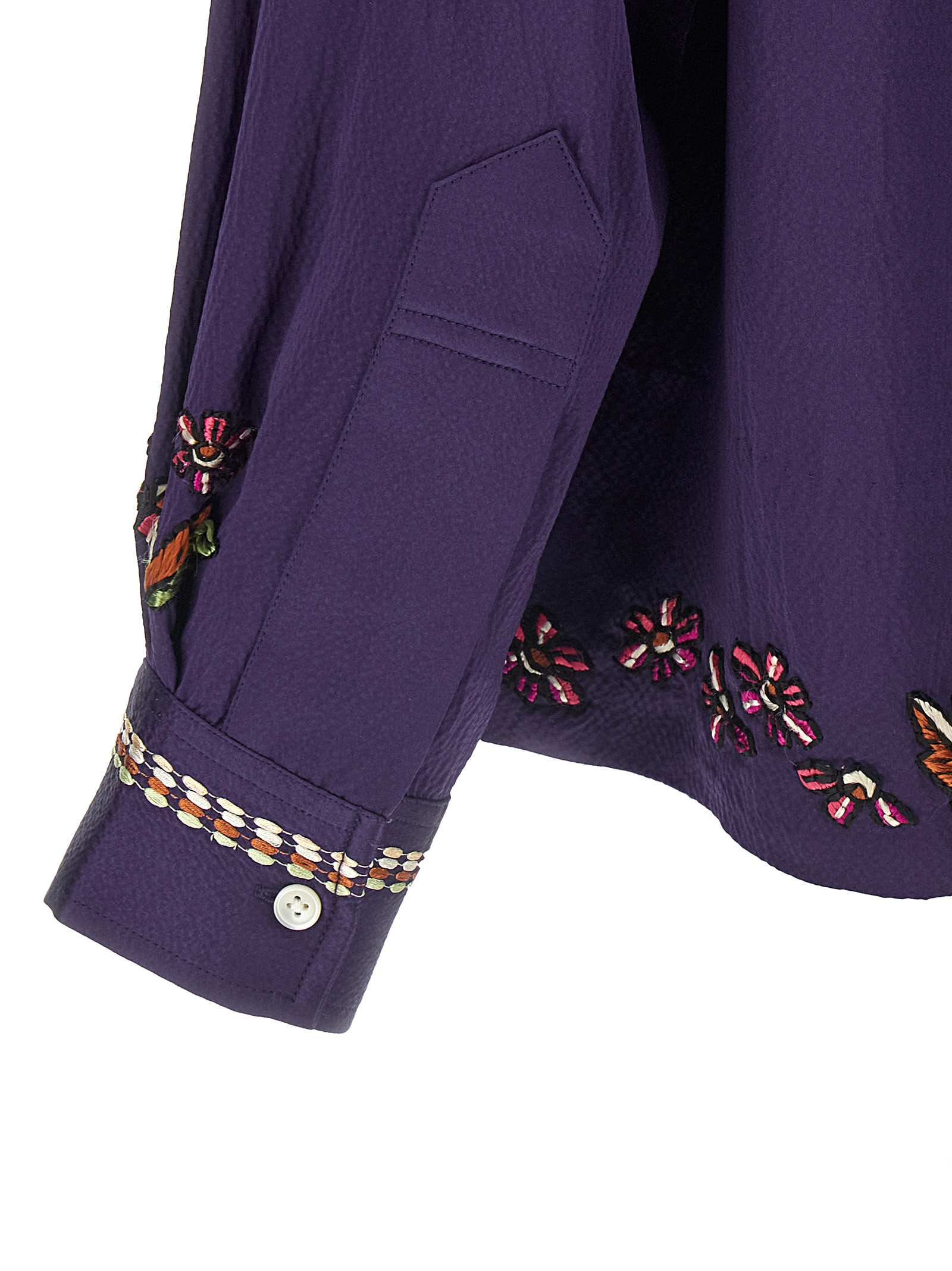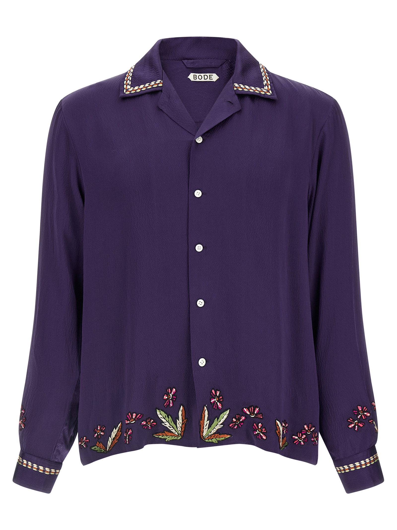 'Dream Souvenir' structured silk shirt with embroidered floral motifs, bowling pattern, front button closure, long cuffed sleeves.