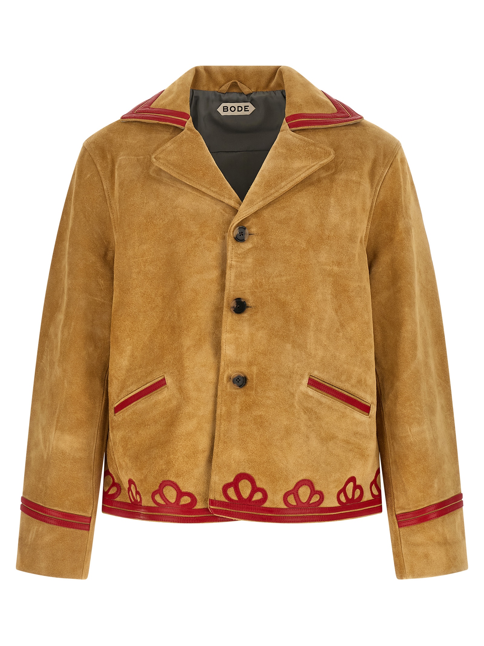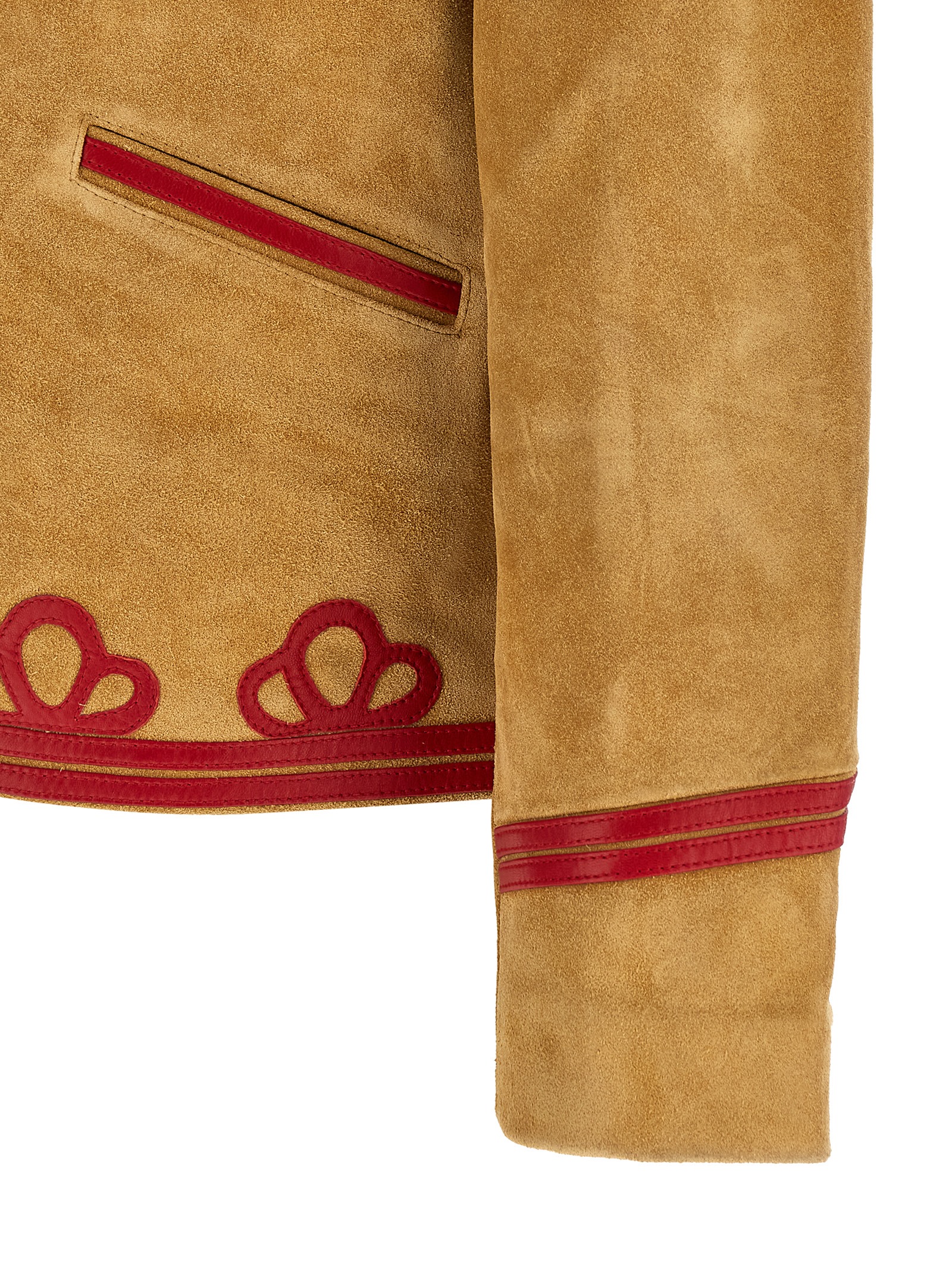 'Trefoil' suede jacket with contrasting smooth leather details, lapel collar, front horn button closure, pockets, long sleeves with dropped shoulders, lining.