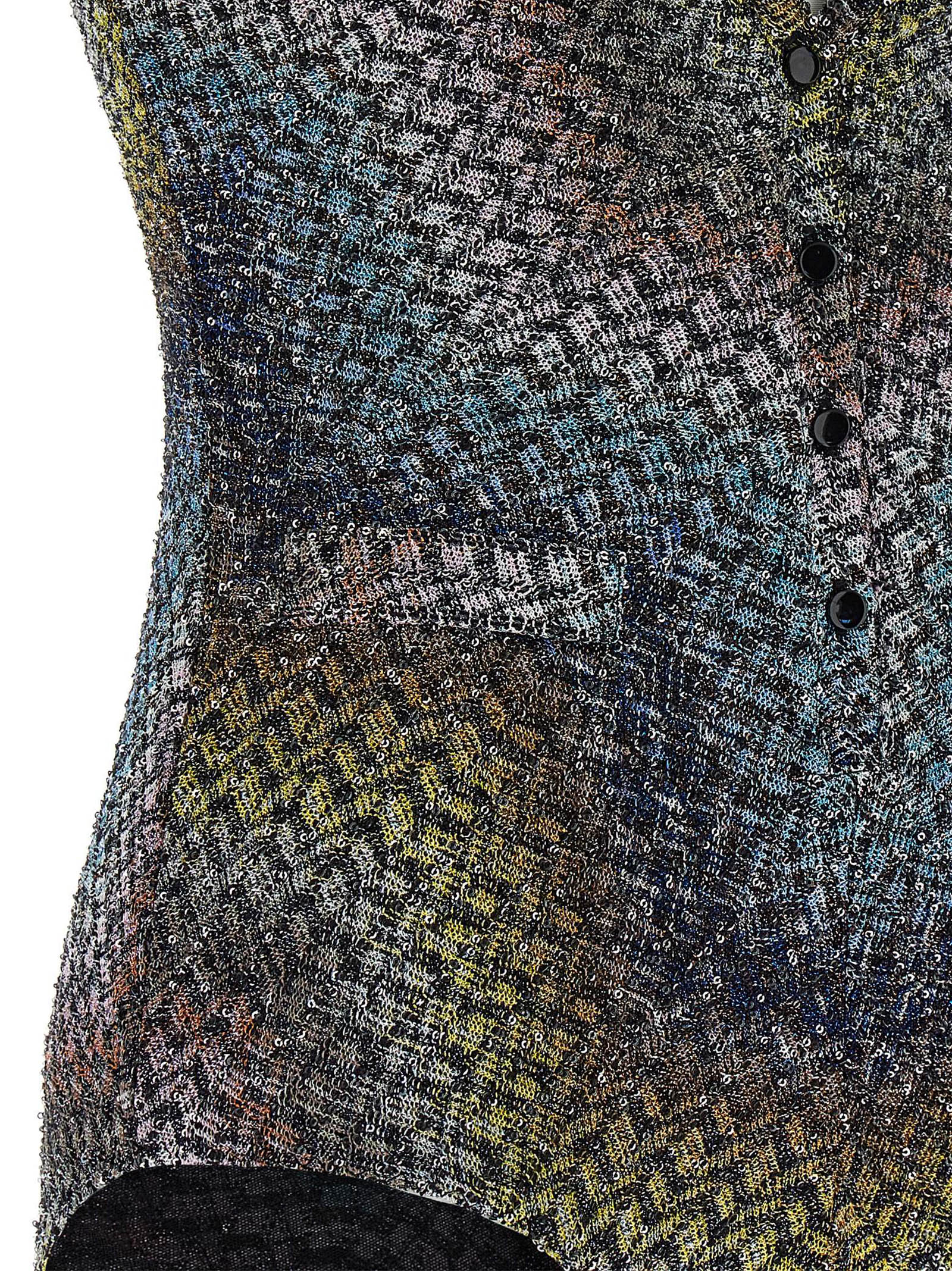 Цельный купальник из смеси ткани с микропайетками и люрексом, выполненный из ткани Caperdoni с зигзагообразным узором, подкладкой, широким V-образным вырезом, застежкой на пуговицы спереди, карманами с эффектом обманчивой перспективы и накидкой-кюлотами.Характеристики товара