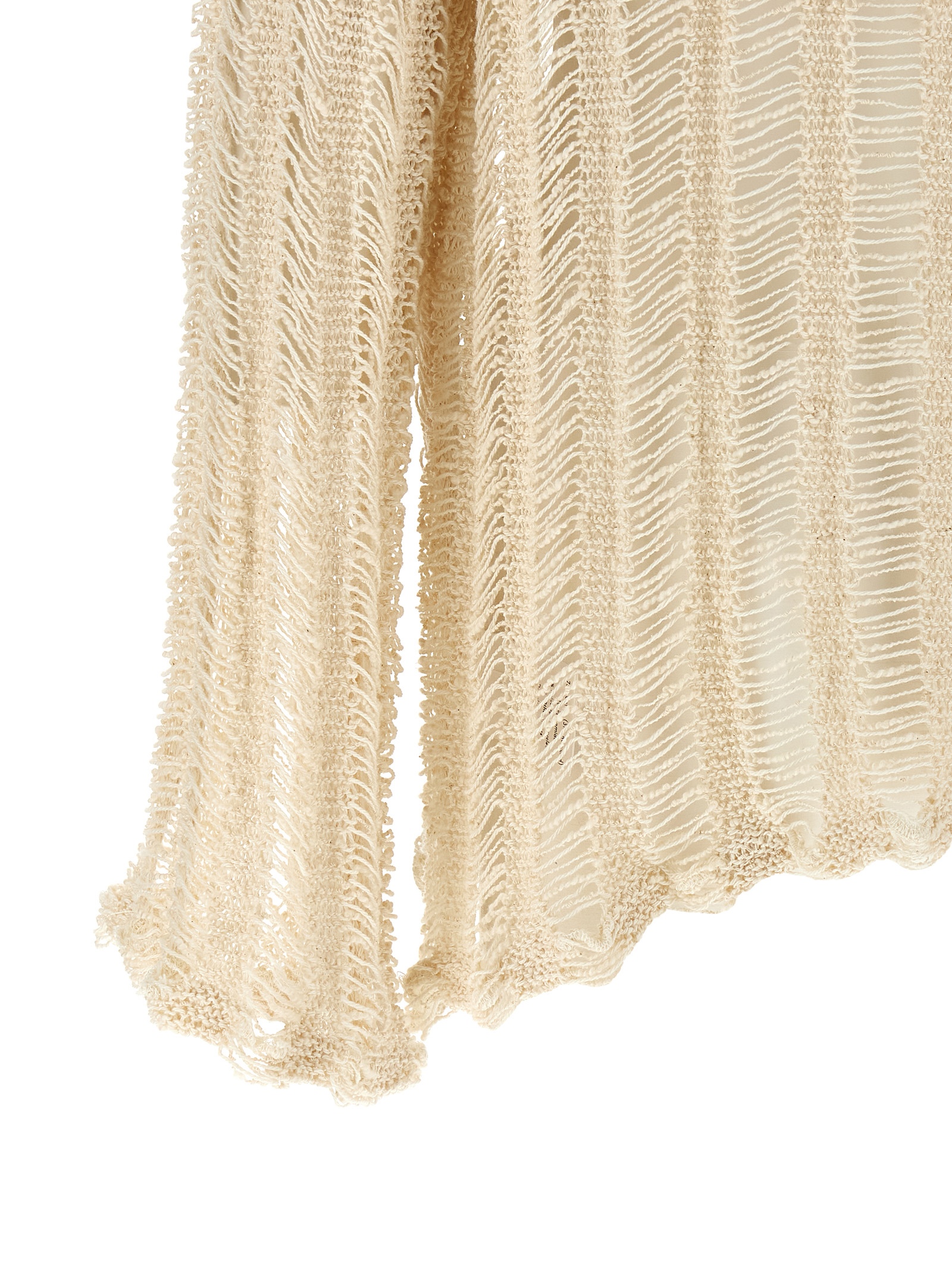 Вязаный крючком свитер «Aestas» из смесовой хлопковой пряжи, расклешенный силуэт, круглый вырез, длинные рукава со спущенными плечами, расклешенные манжеты, асимметричный подол. ЭКОЛОГИЧНОСТЬ: Изделие изготовлено из переработанных материалов.