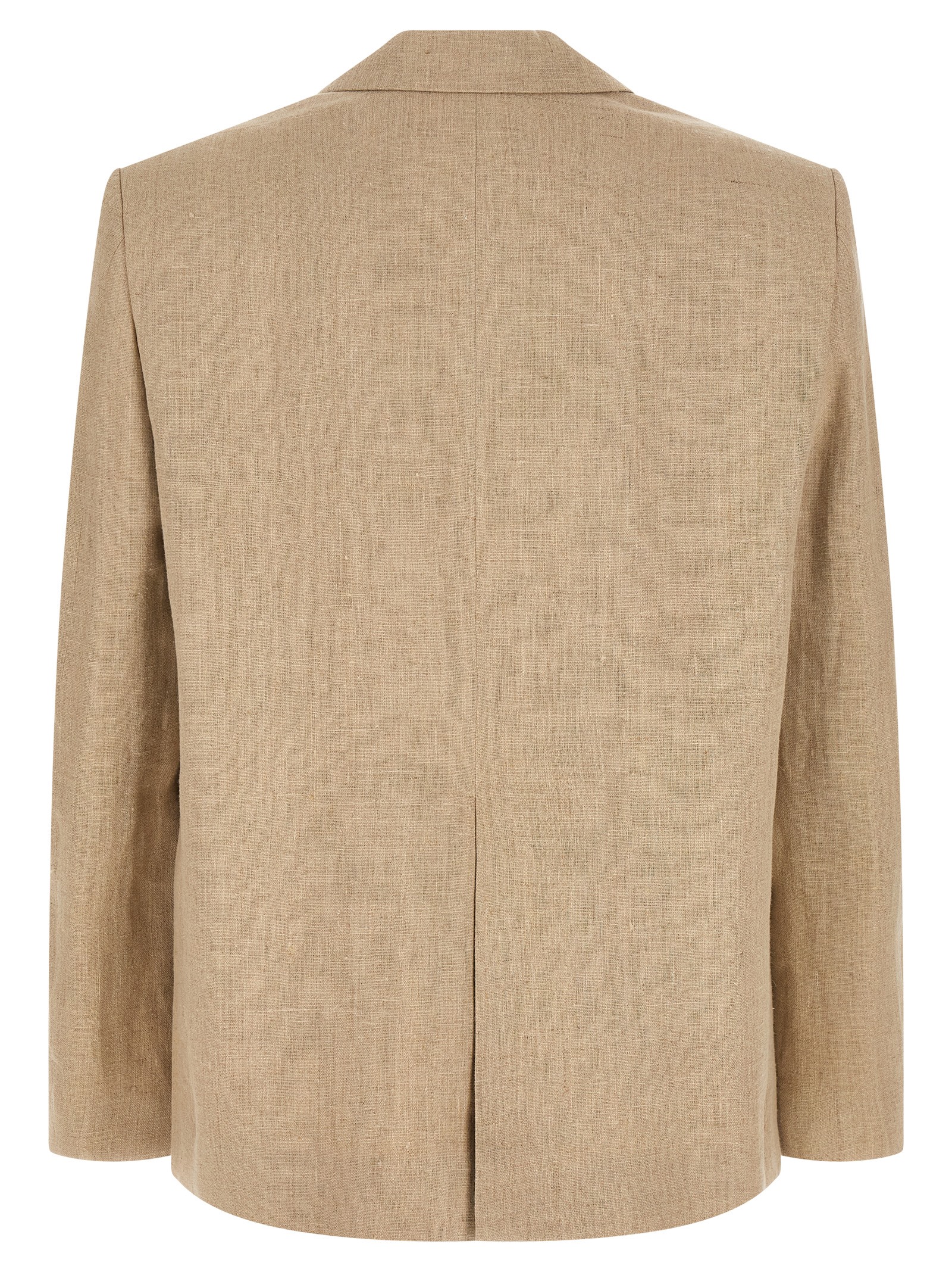 Двубортный блейзер «Донован» из прочной льняной ткани с застежкой на роговые пуговицы спереди, зеркальными лацканами, накладными карманами, подплечниками, длинными рукавами, разрезом на спине, вискозной подкладкой и одним внутренним карманом.