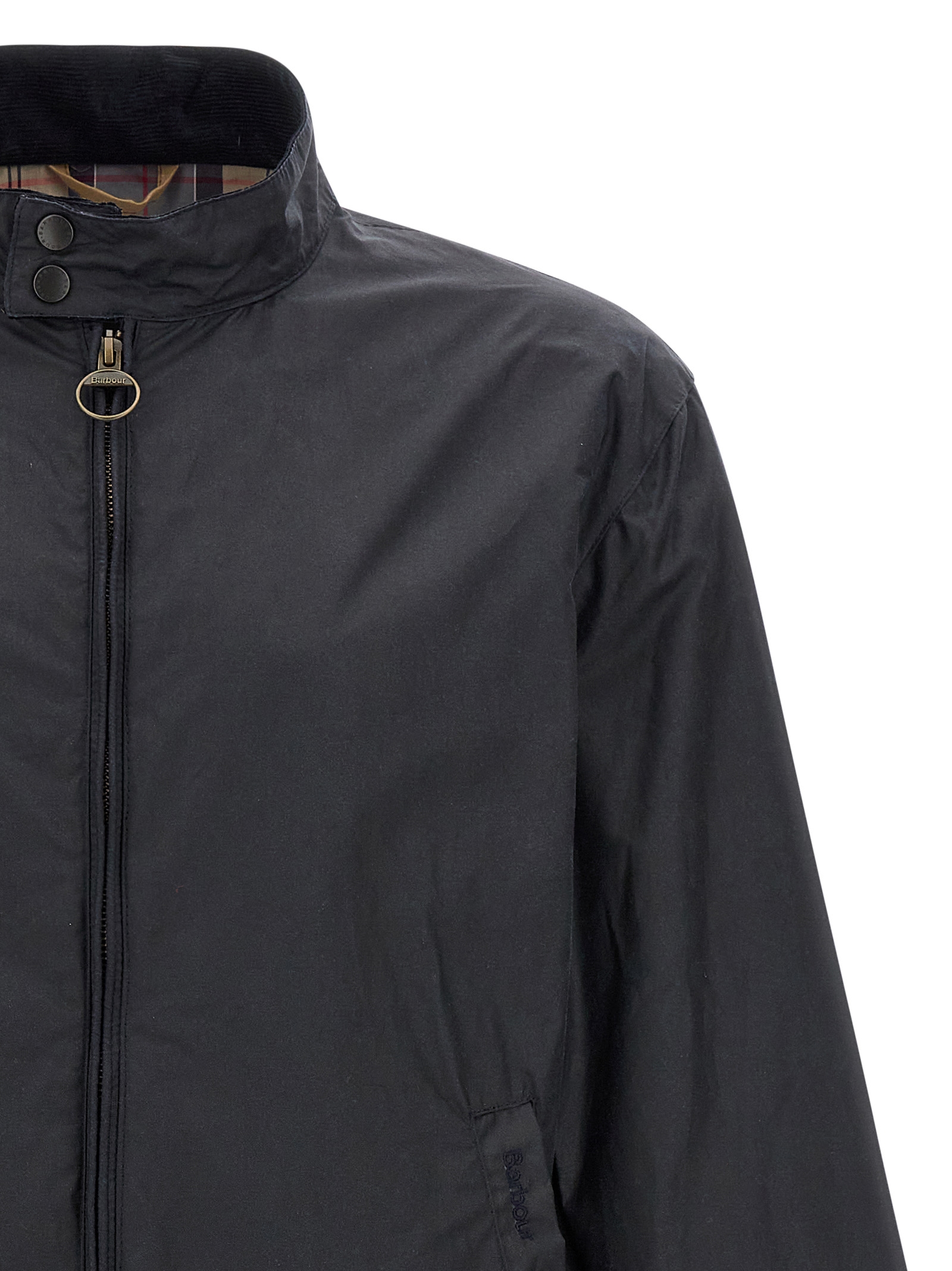 Royston' waxed cotton jacket with ribbed knit details, tone-on-tone front logo embroidery, zip closure, pockets, high neck with snap button closure, long cuffed sleeves.