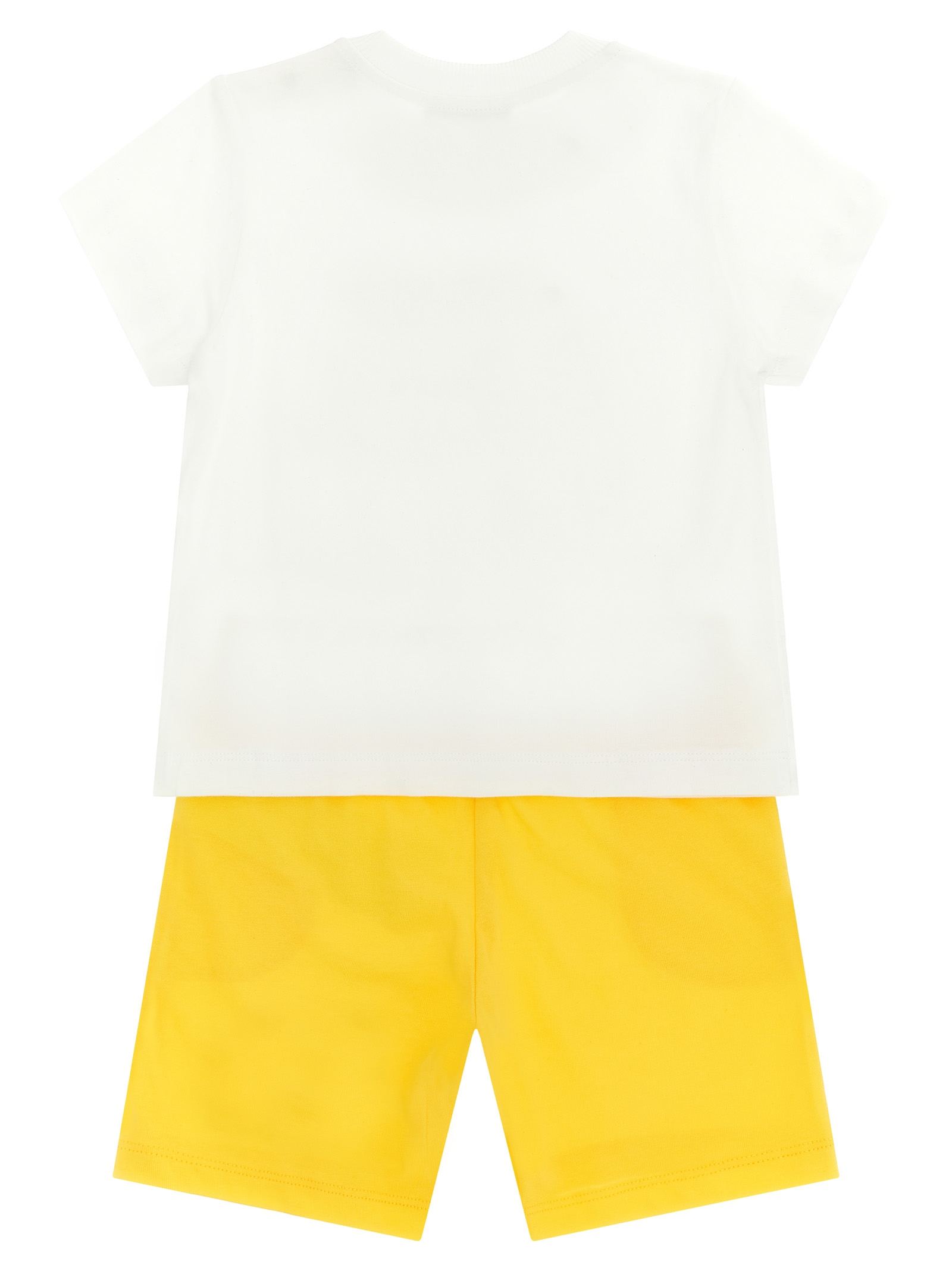 Cotton jersey suit with front 'Moschino Teddy Bear' print consisting of crewneck t-shirt, snap buttons on the left shoulder, short sleeves and Bermuda shorts with elastic waistband and pockets.