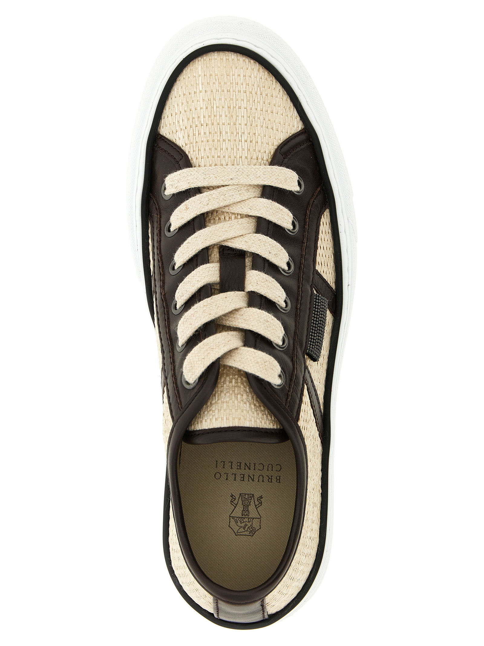 Braided techno raffia sneakers with contrasting smooth leather details, water-repellent cotton blend fabric lining, side Monile 'Shiny Tab' detail, lace-up closure, rubber sole. Handcrafted product, any imperfections are to be considered characteristics of uniqueness.