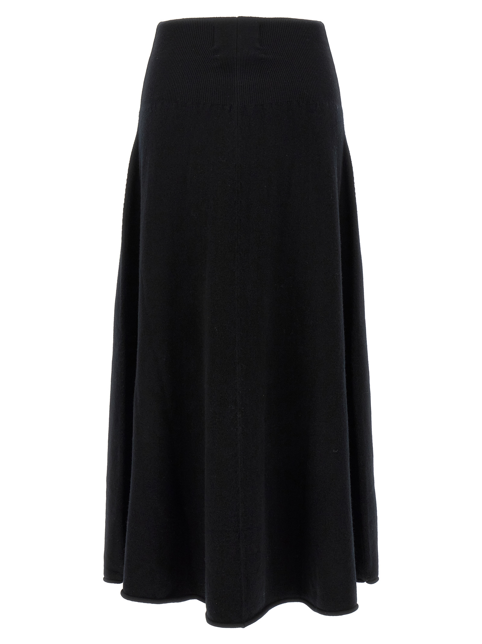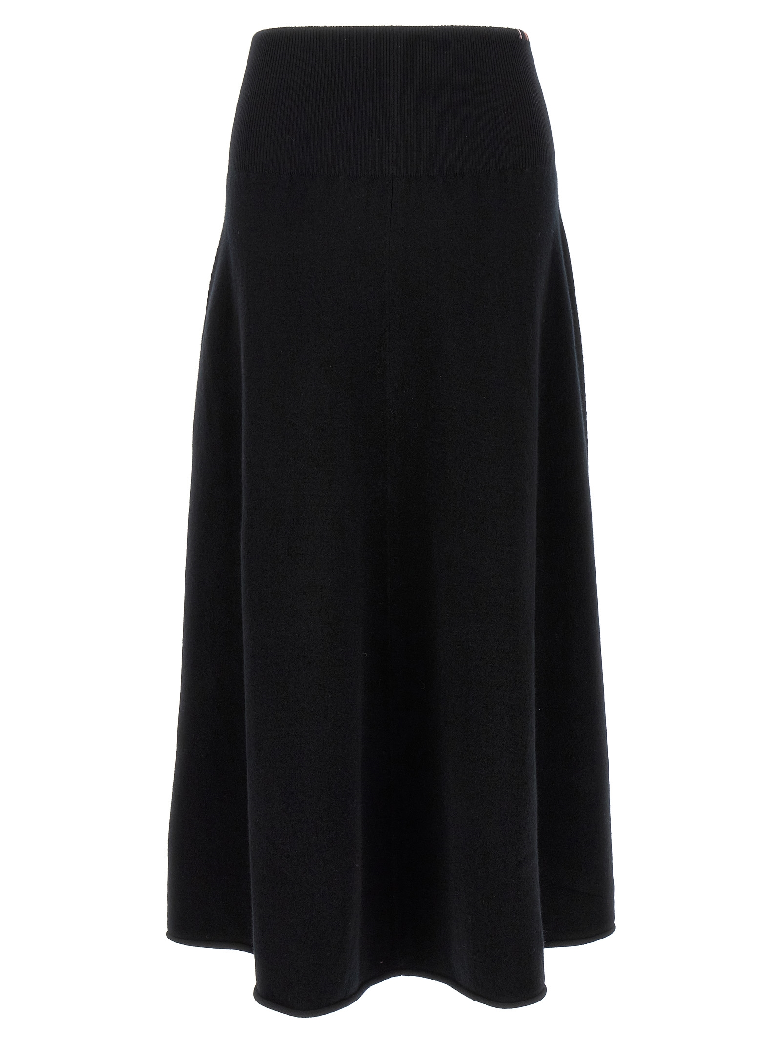 'N°388 Ease' cashmere midi skirt, flared silhouette, elastic waistband, and raw cut hem.