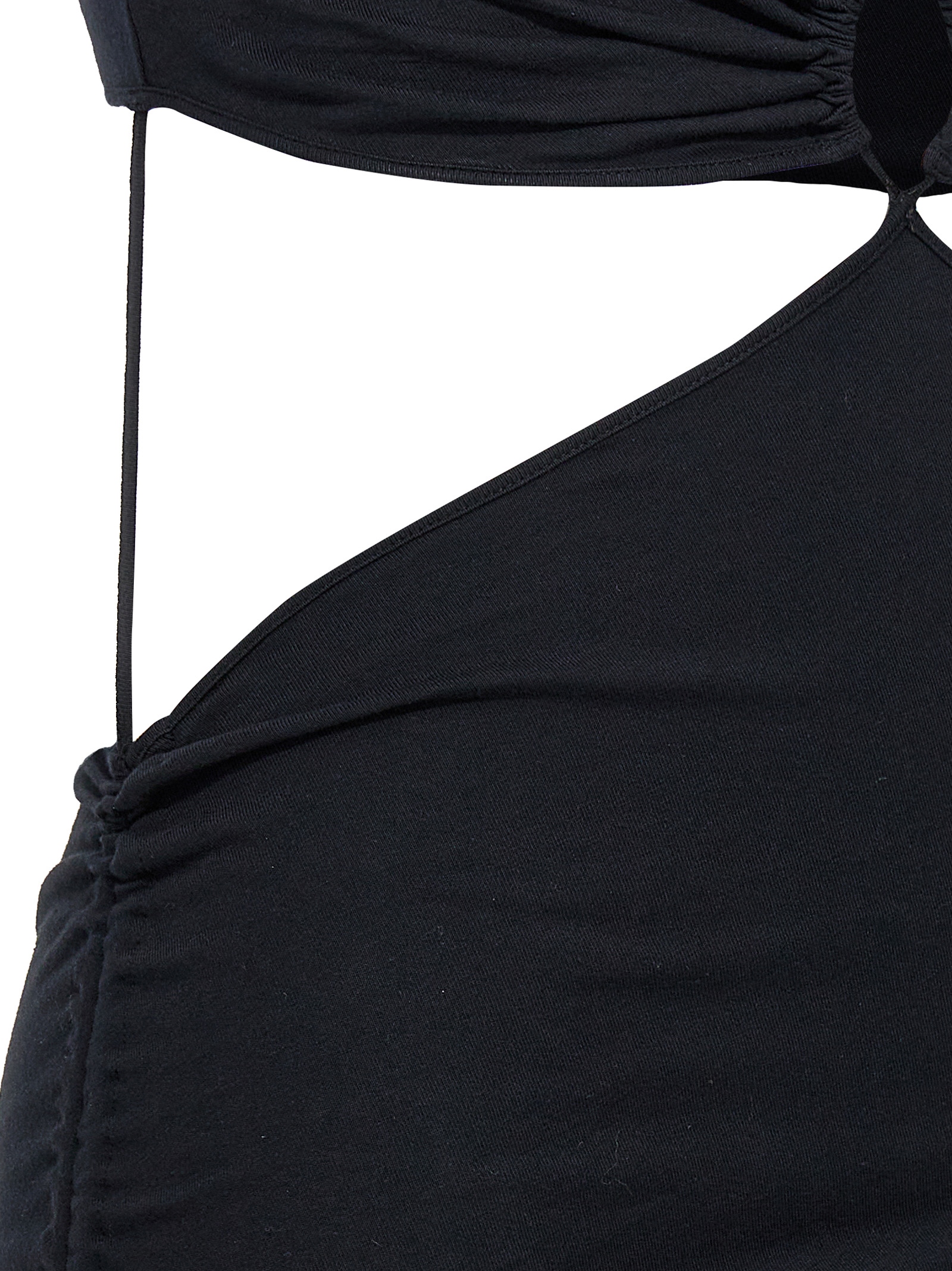 Cotton t-shirt dress with cut out details at the front and back, crewneck, short sleeves and a drawstring, gatherable on the side on the bottom hem.