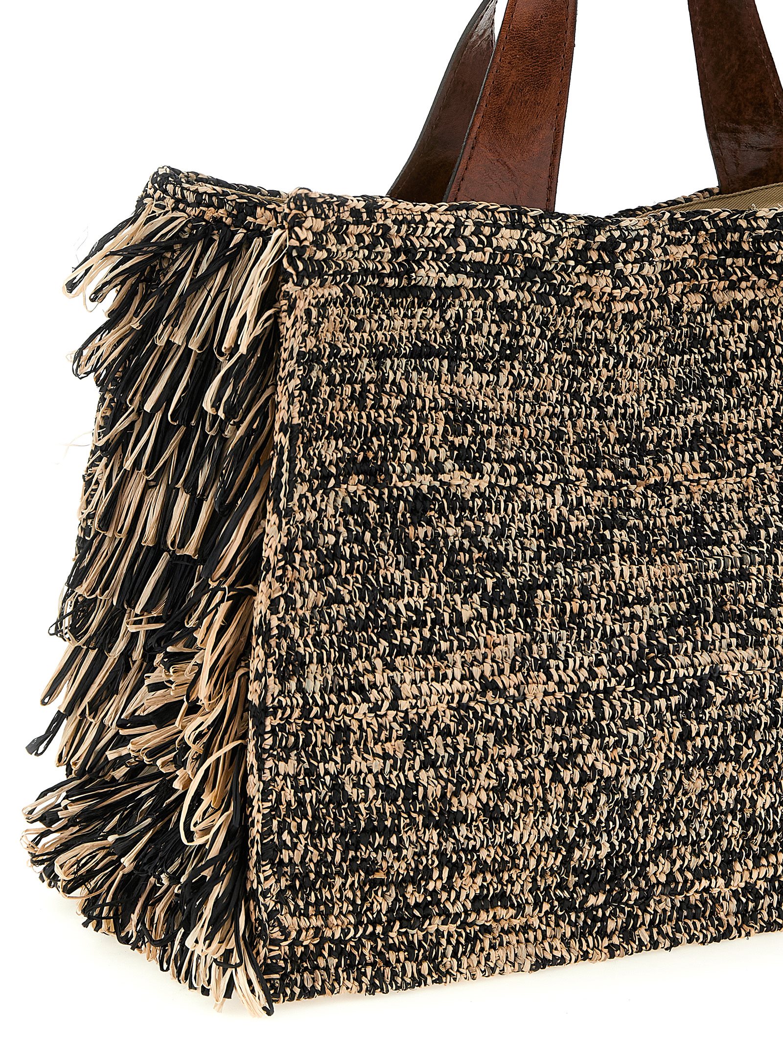 Сумка «Онжа» из двухцветной вязаной рафии, прямоугольной формы с бахромой по бокам, хлопковой подкладкой, магнитной застежкой и внутренним карманом, двойной фиксированной ручкой из кожи зебу растительного дубления. Изделие ручной работы, любые незначительные дефекты следует рассматривать как отличительные признаки уникальности.