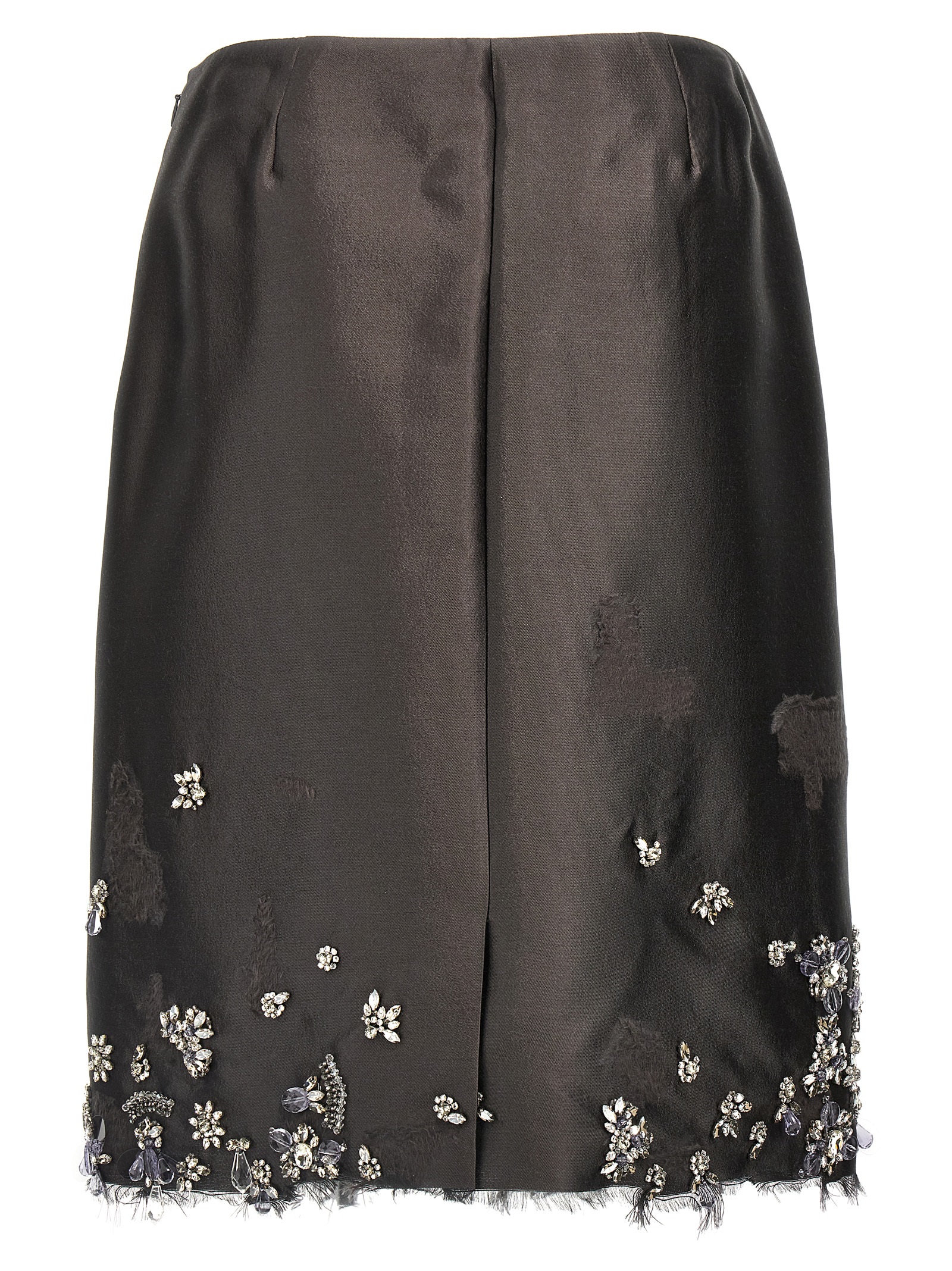 Silk and wool blend skirt with used effect details, jewel applications, raw cut, side zip closure, underskirt.