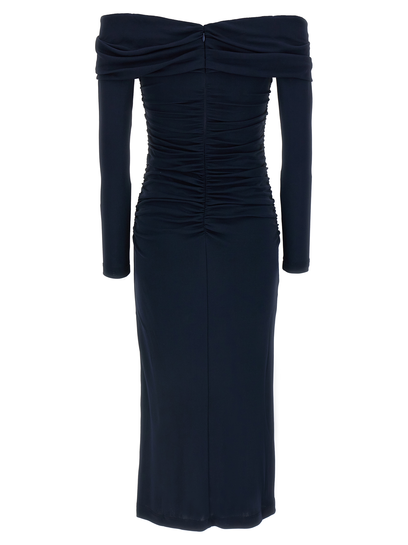 Off-the-shoulder 'Off-Shoulder 3/4 SLV Ruched Midi' fluid fabric dress with rigid U-neck and dropped shoulder straps, 3/4 sleeves, front and back draping, back zip closure, underskirt.