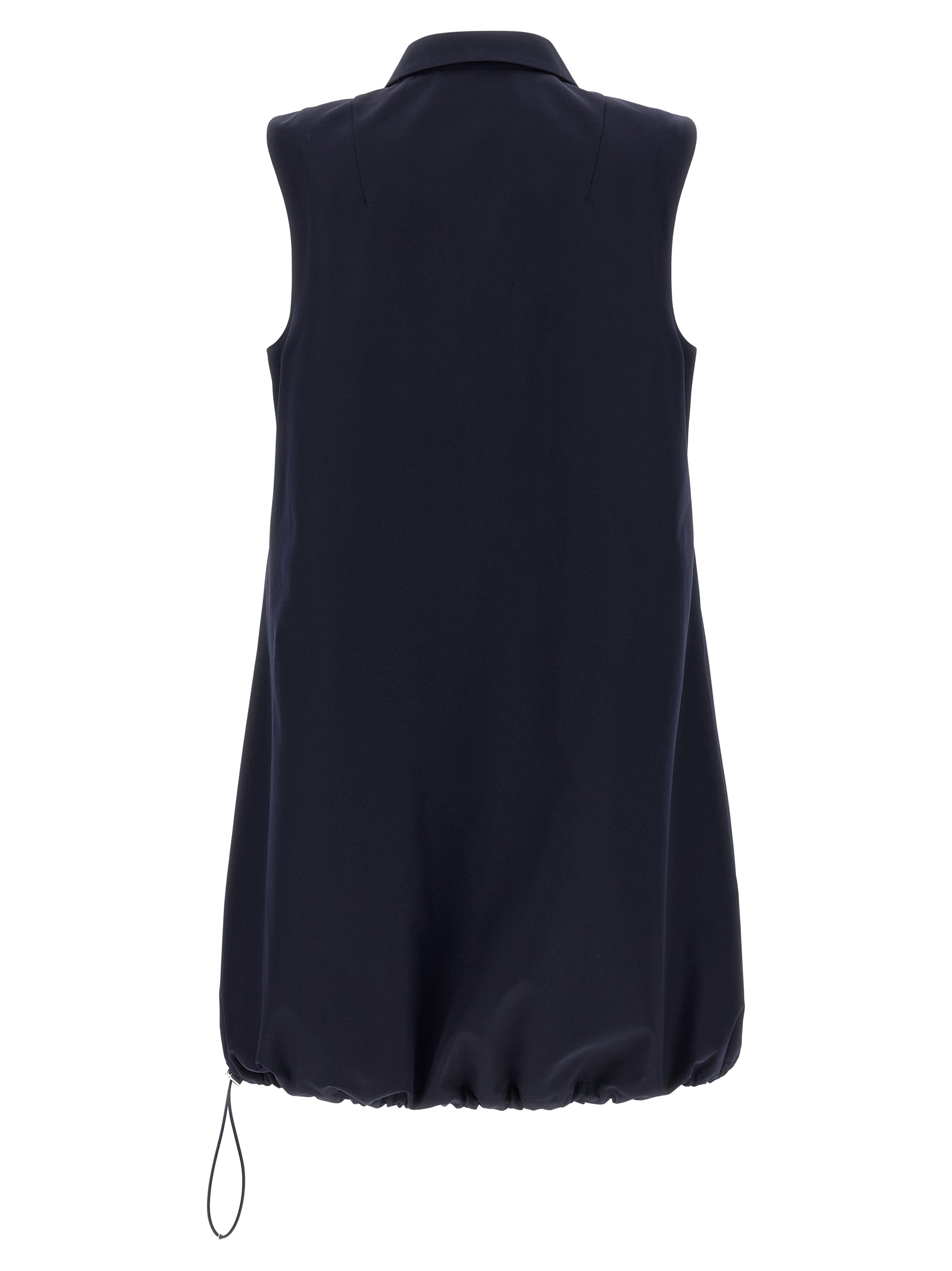 Poplin mini dress, chemisier model, triangle fabric logo and front half-zip, flared, sleeveless silhouette, pockets, drawstring on the hem, unlined.