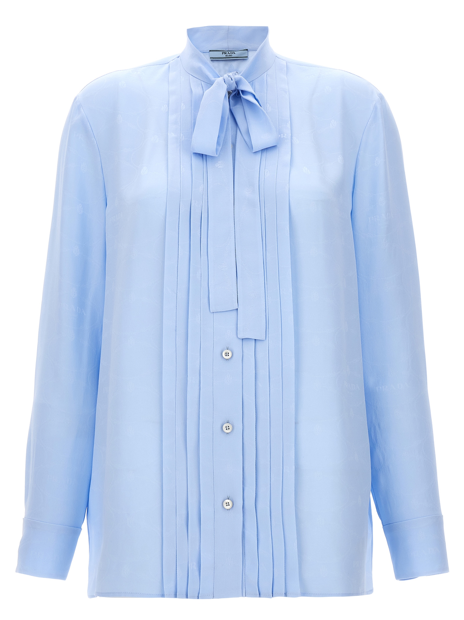 Silk shirt with all-over logo pattern, button closure with pleated detail on the sides, long sleeves with cuffs, bow to tie at the neck.