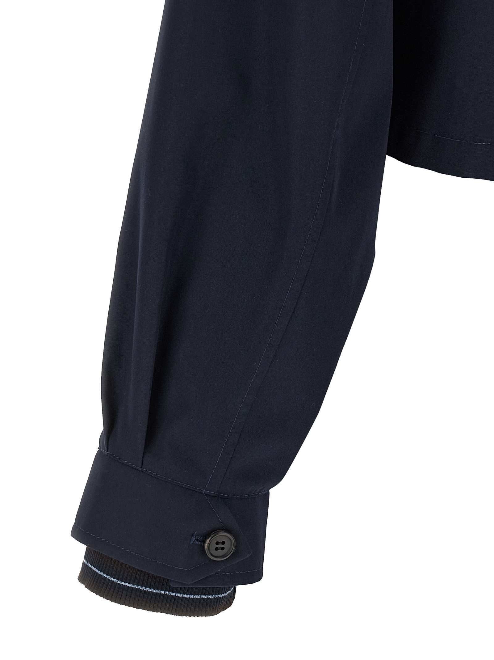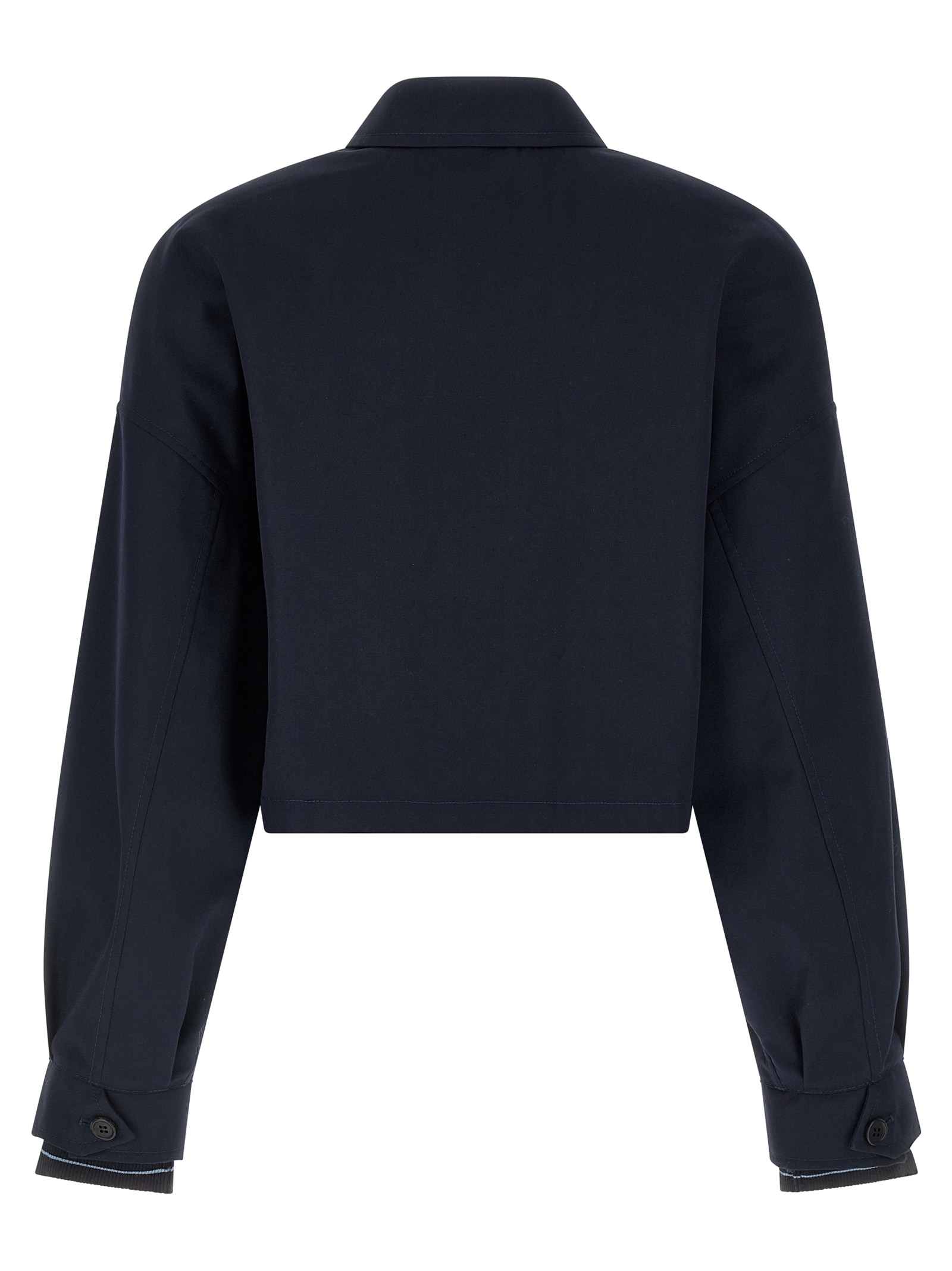 Crop poplin blouson with triangle enameled metal logo and front zip closure, shirt collar, pockets, long sleeves with dropped shoulders and double layer cuffs with ribbed stretch knit insert, unlined.