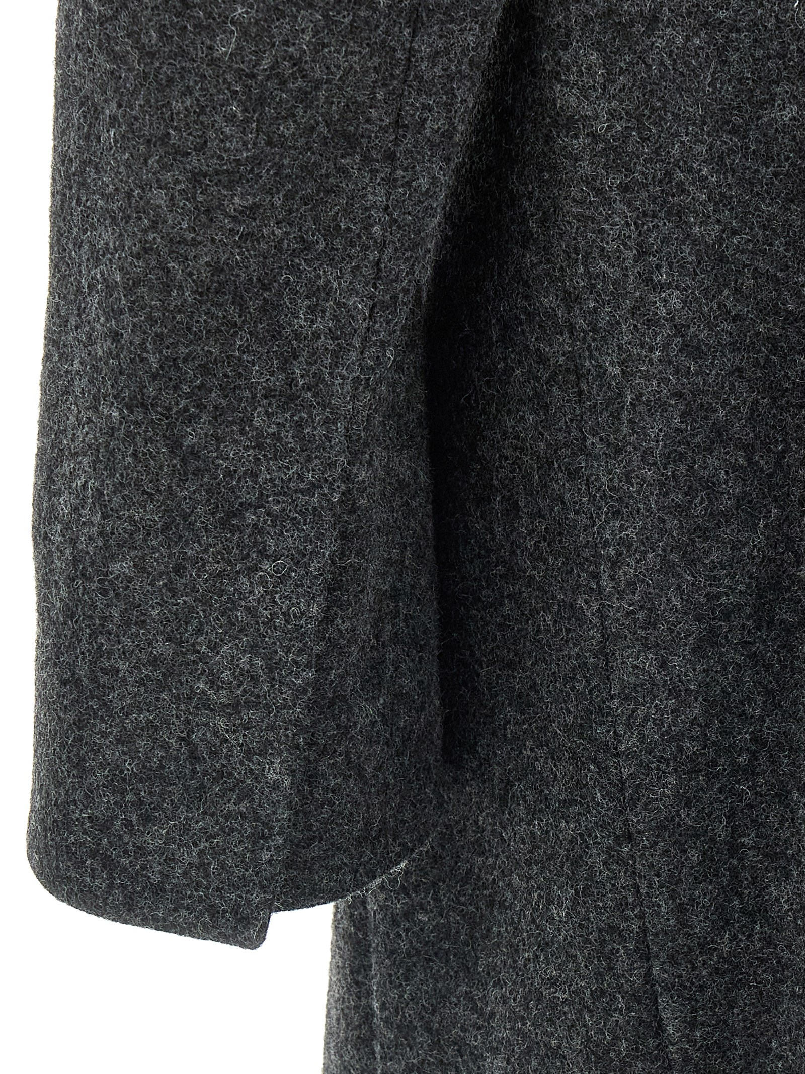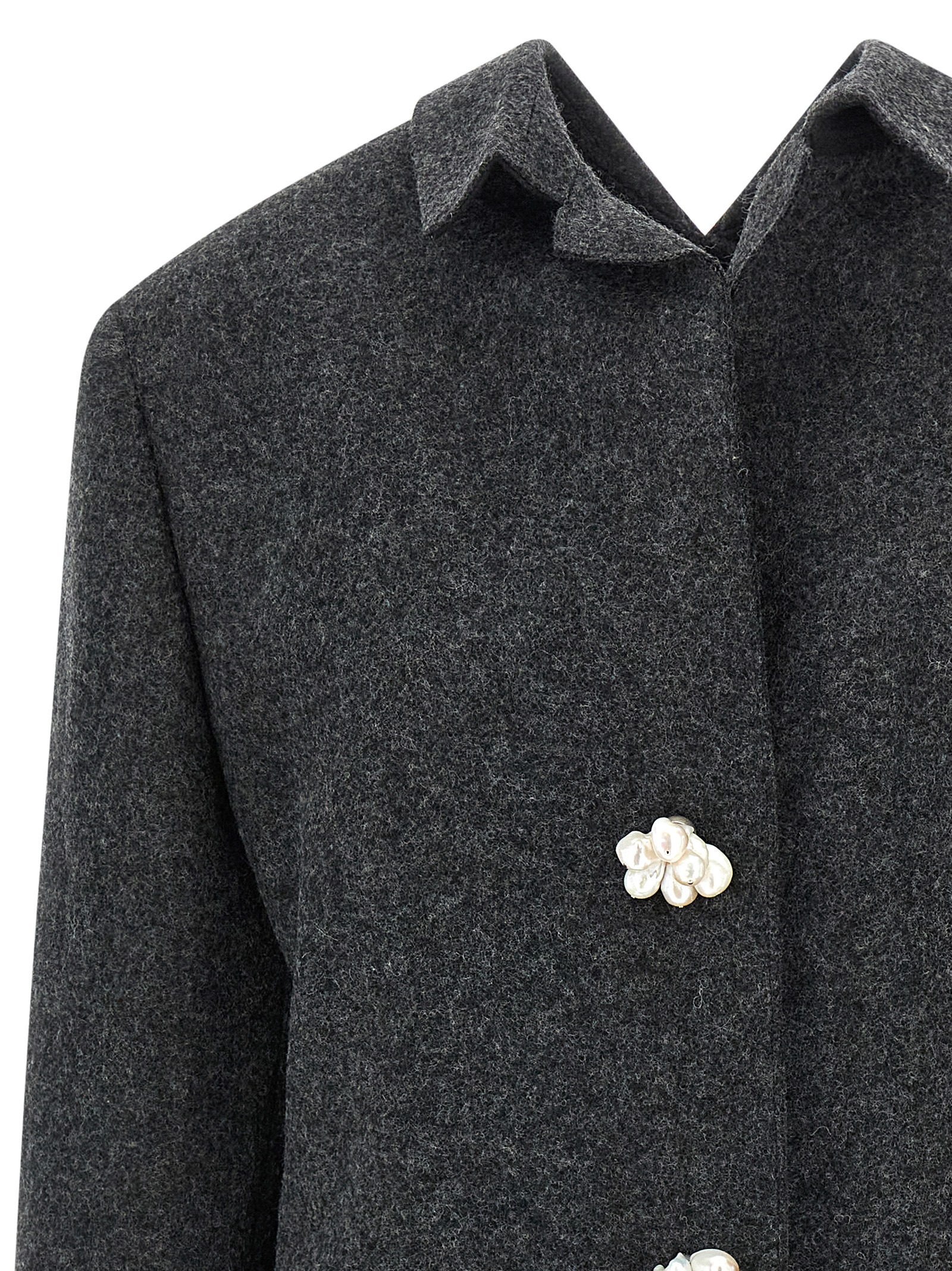 Shetland wool single-breasted coat with reverse applied collar with jewel snap button closure, pockets, structured shoulder strap, long sleeves with split on the cuffs and back split.