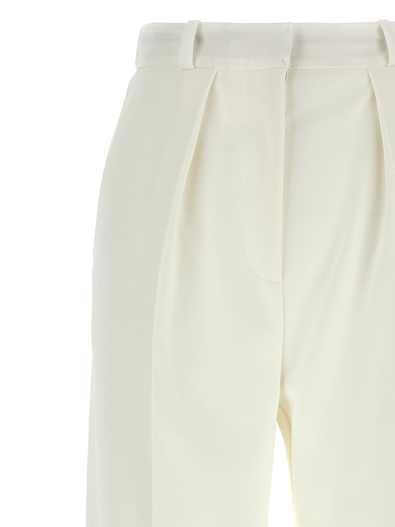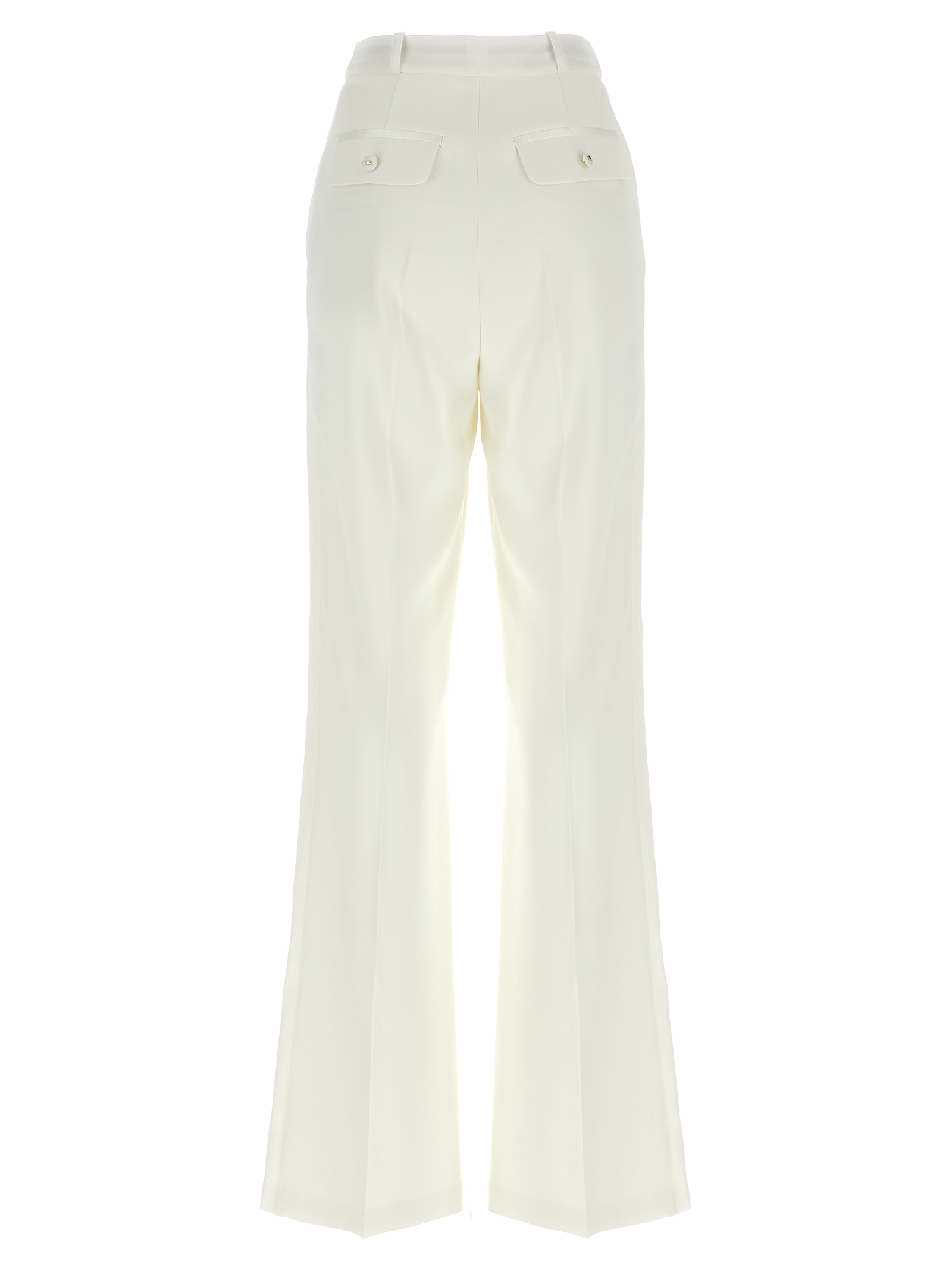 Light crêpe pants, tuxedo-effect satin side inserts, pins, pressed pleat, flared leg, pockets, hook and front button zip closure, monogram satin lining.