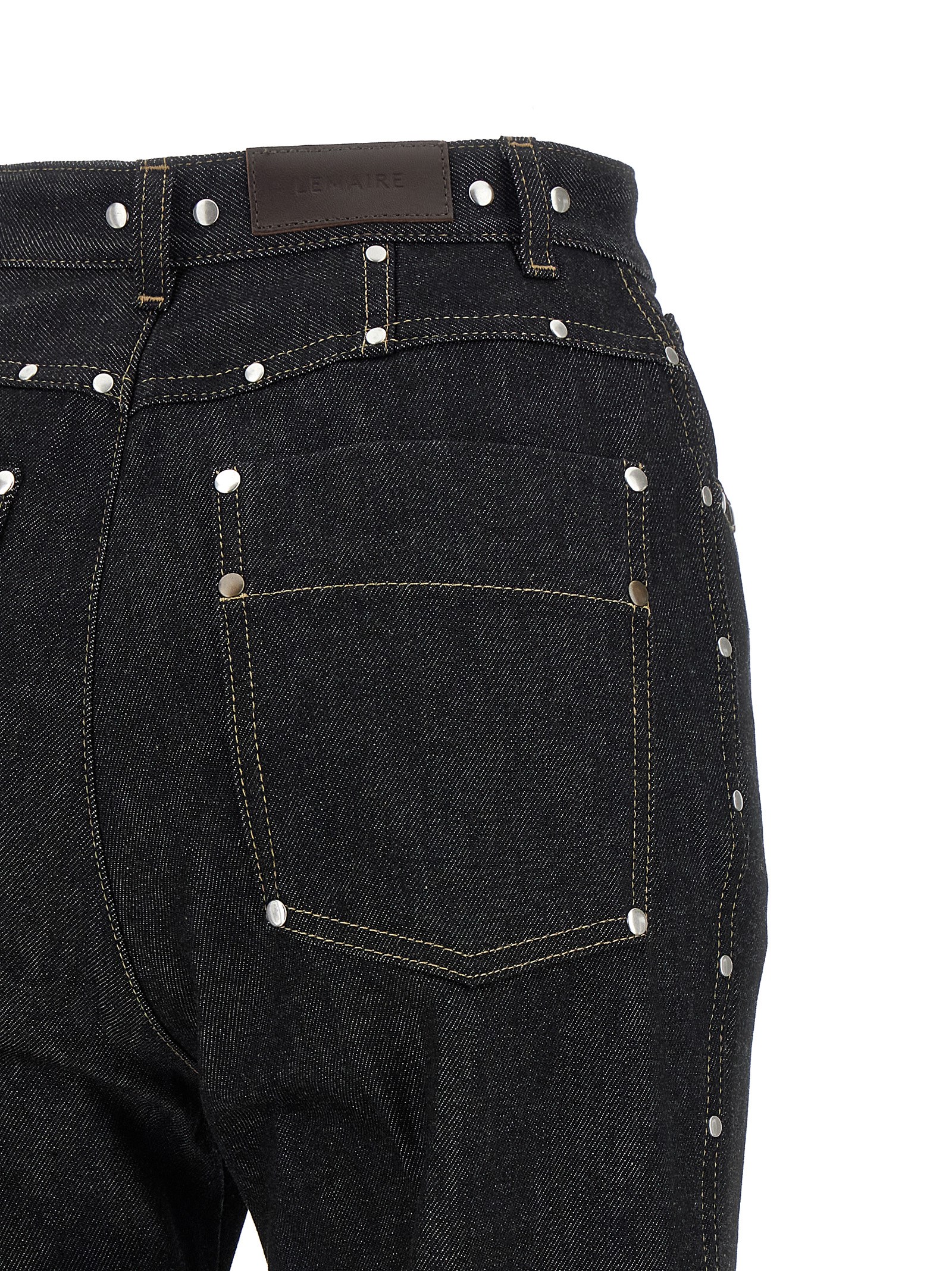 Heavy denim jeans with metal rivets of different sizes, contrast stitching, high waist, straight leg, stretched pleat, front zip and button closure, five pockets, leather logo label with embossed logo at the back.Характеристики товара