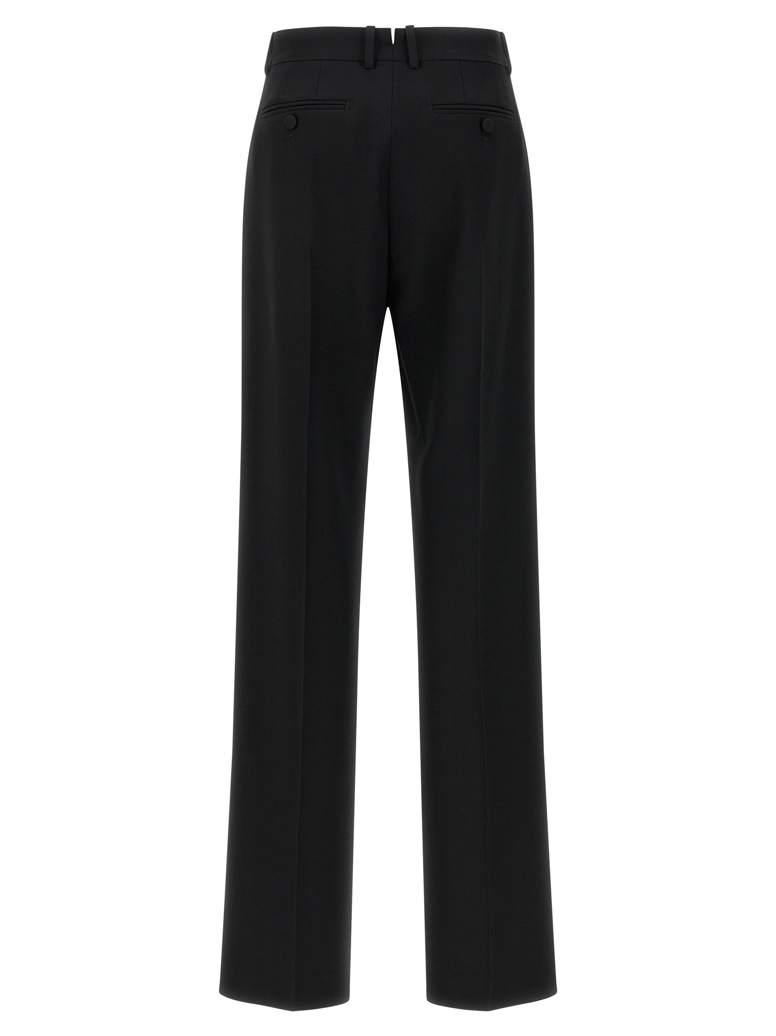 Tailored trousers in grain de poudre virgin wool, straight leg, pince, ironed crease, zip, hook and front button closure, pockets.