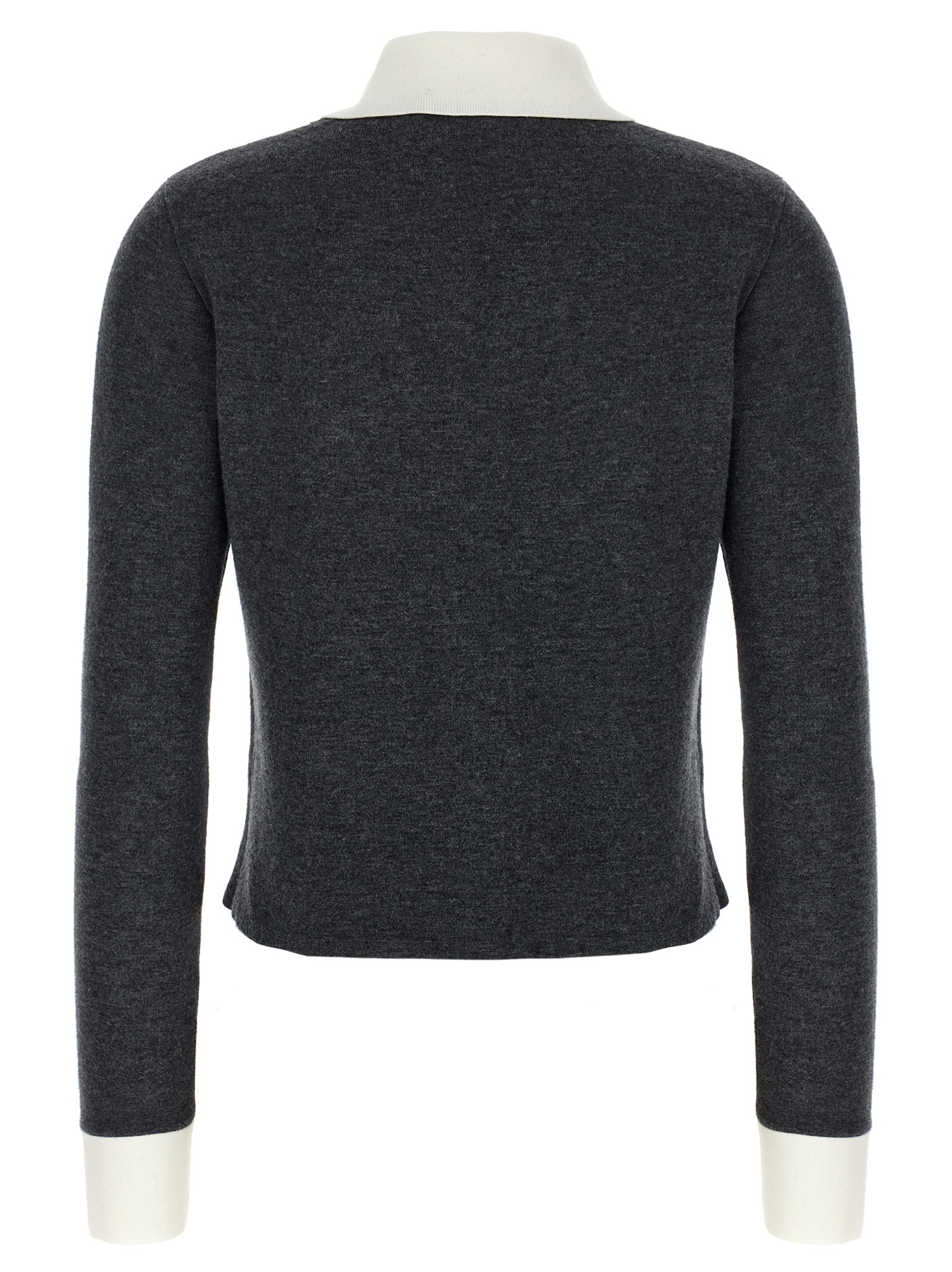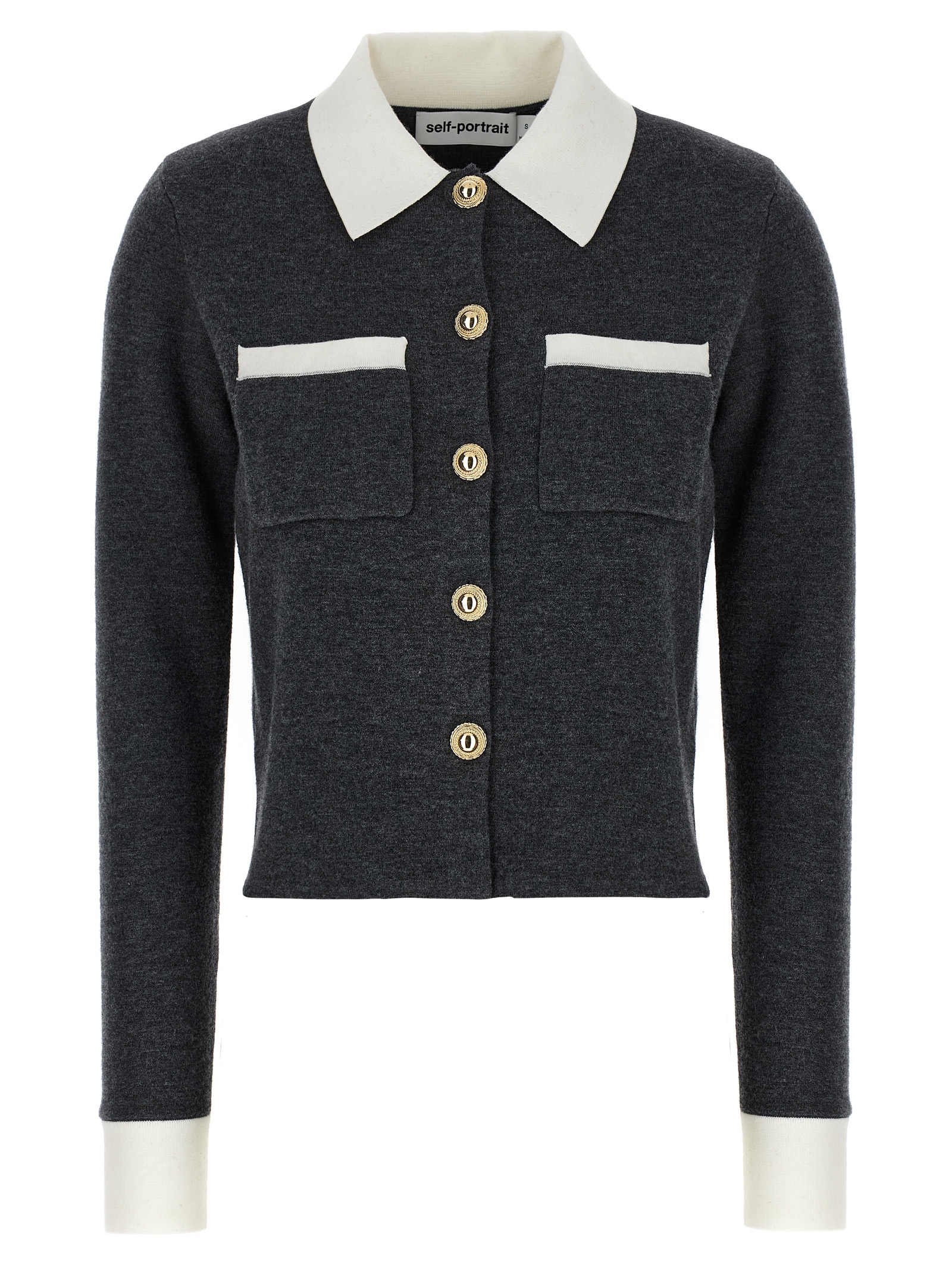 'Grey Contrast Collar' cardigan in stretch wool and cashmere blend with contrast details, shirt collar, front button closure, pockets, long cuffed sleeves.