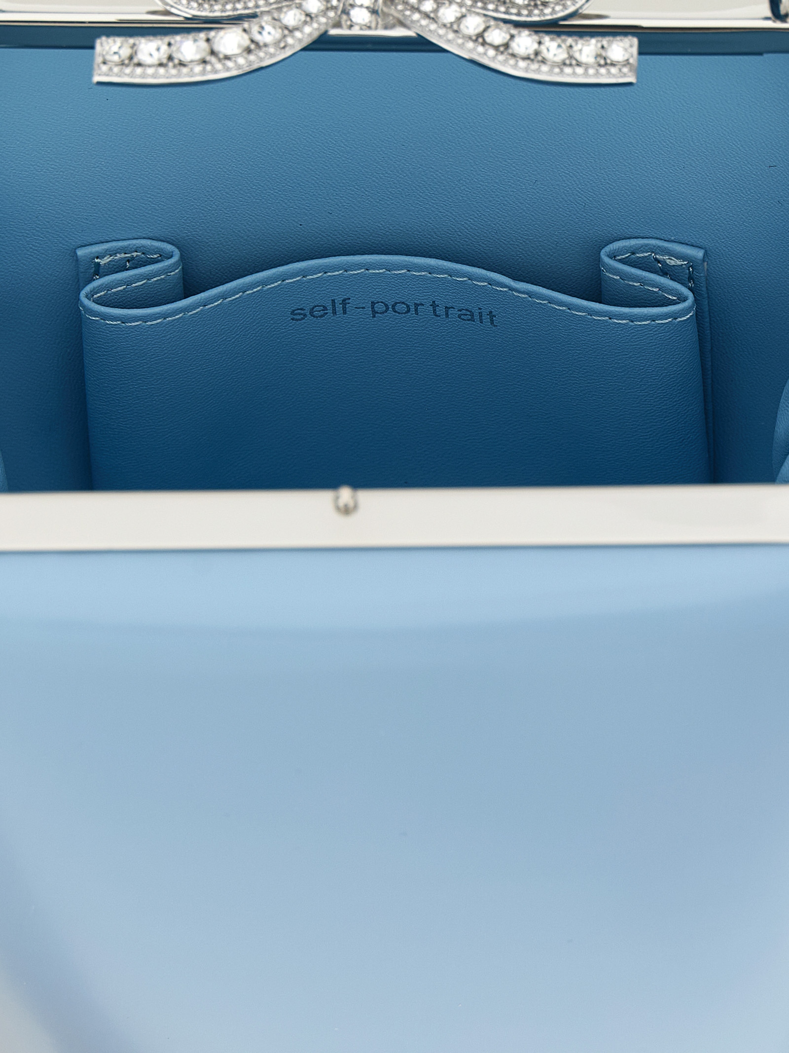 'Blue leather bag' leather handbag with metal details, fixed handle, snap closure with rhinestone metal bow detail, front logo print.Характеристики товара
