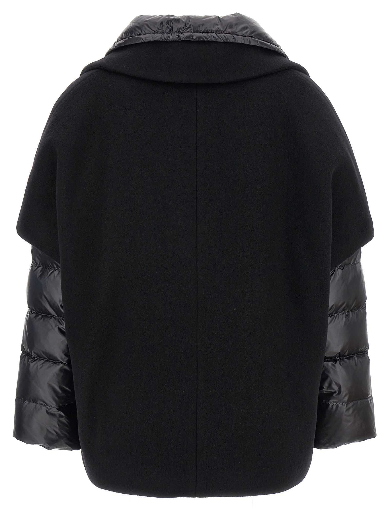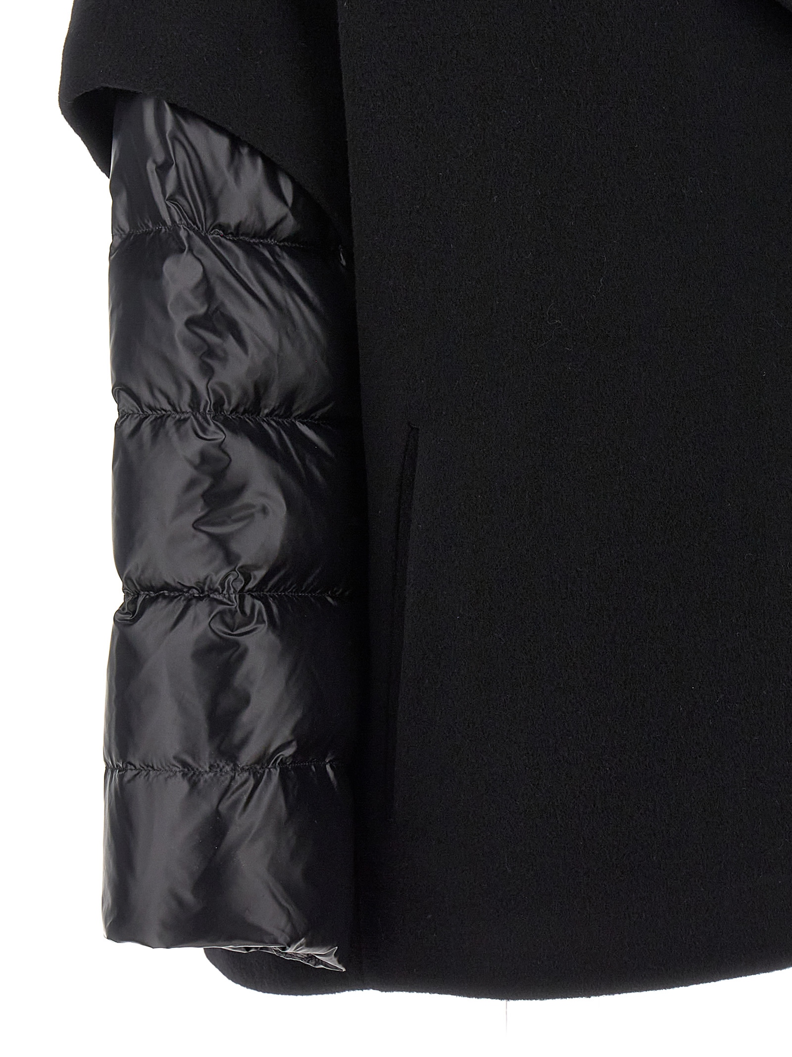 Quilted nylon down jacket with goose feather padding, overlapping and removable wool blend hood insert, button closure, pockets, long sleeves
