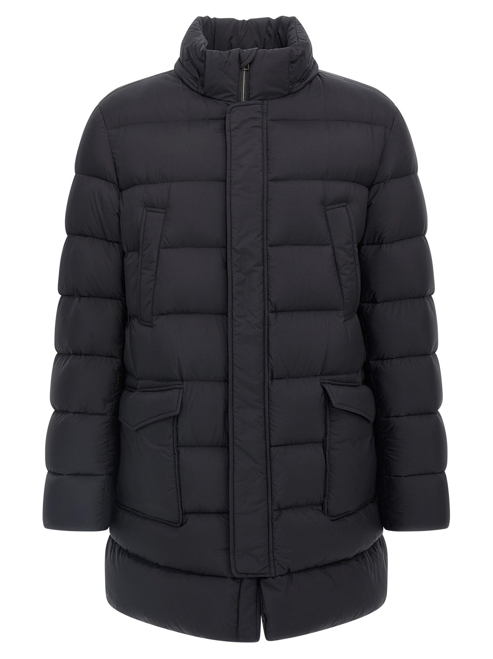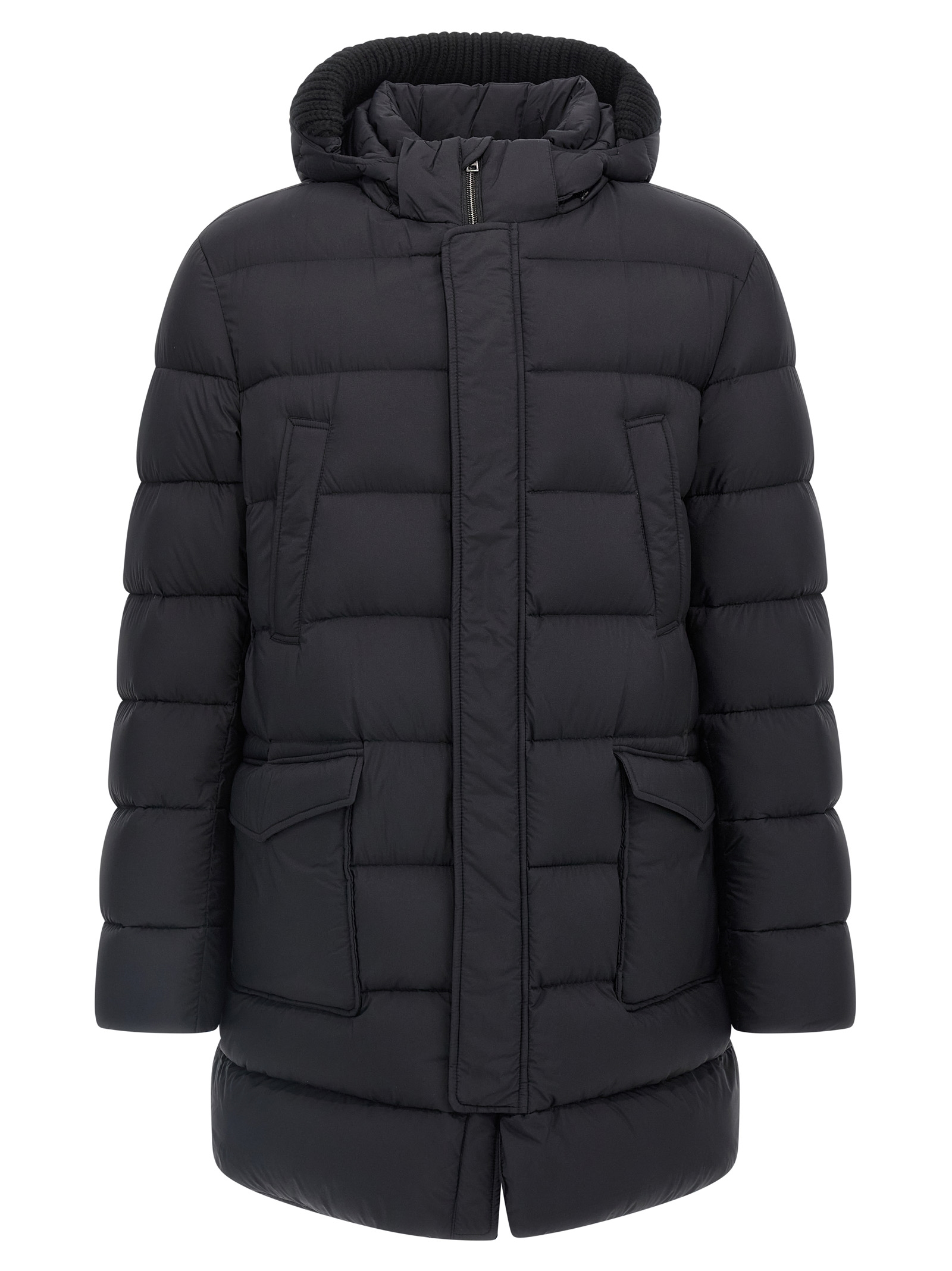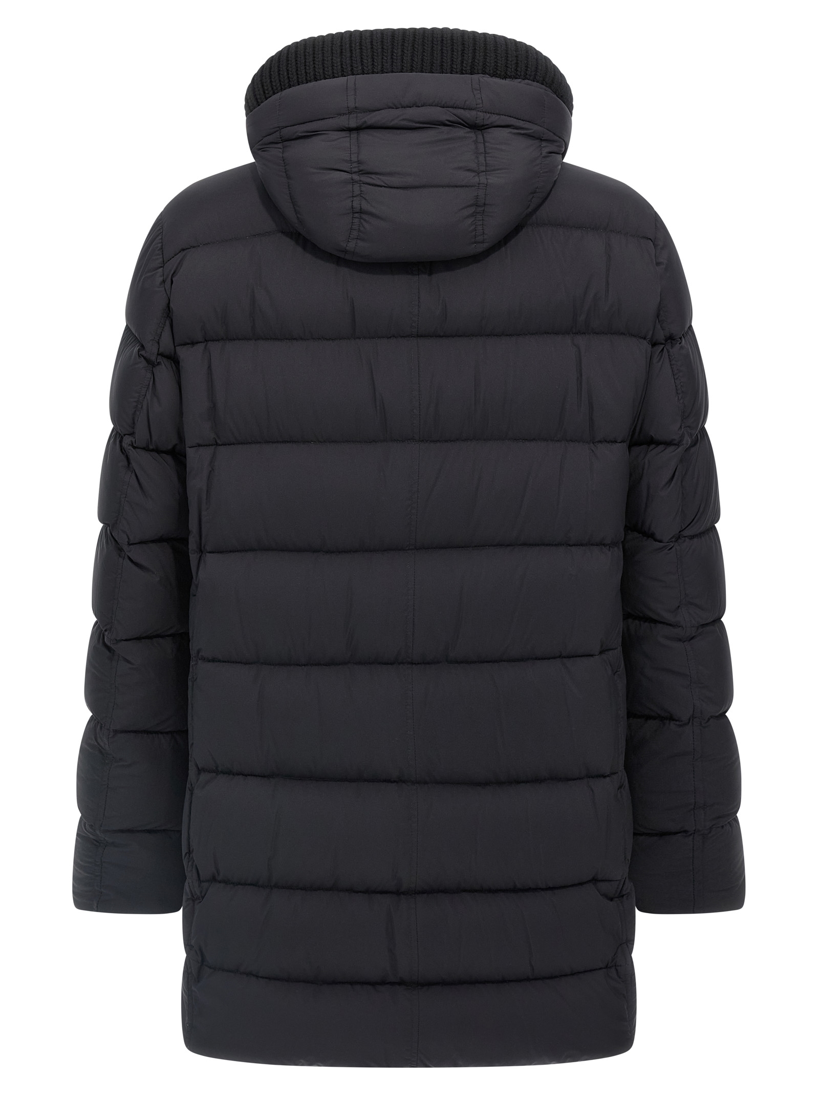 Long 'Il Parka' nylon microfiber down jacket slightly waterproof goose down padding, removable hood with removable stretch ribbed knit detail, front zip and snap button closure, pockets, long sleeves.