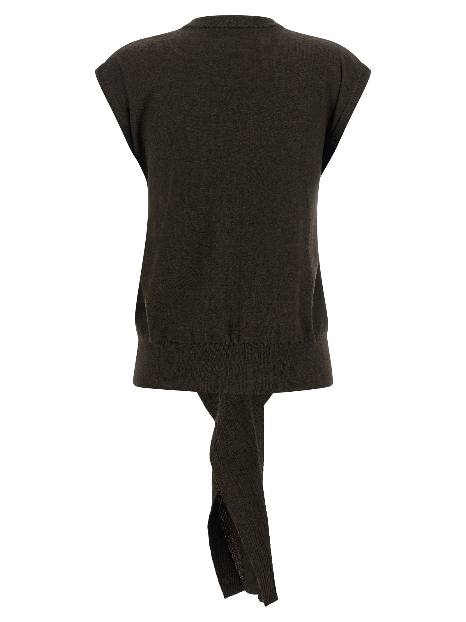 Knitted merino wool blend top, crew neck, with side panels that feature buttons on one side and eyelets on the other, allowing you to tie or tie it.