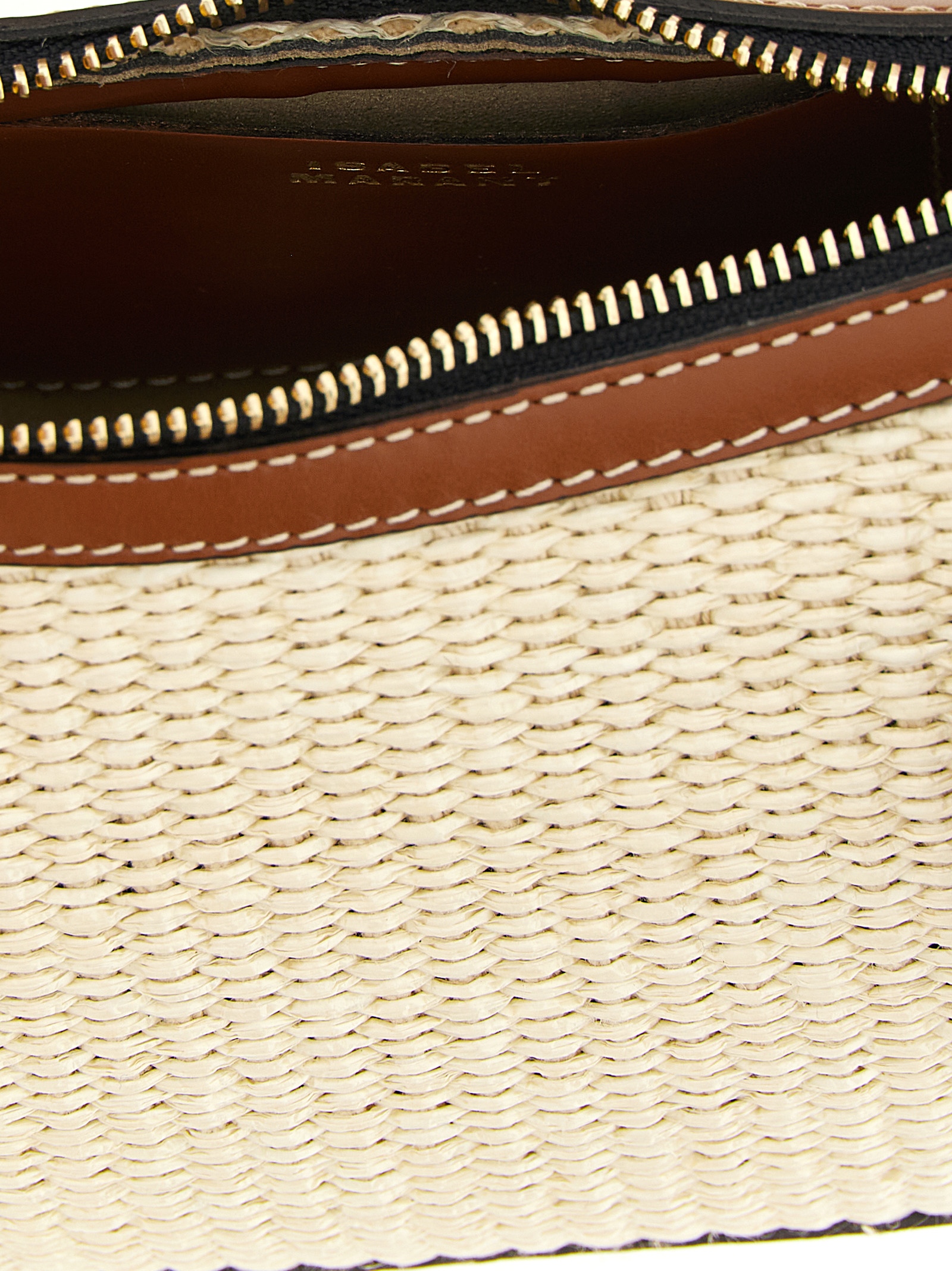 'Oskan Moon' smooth leather shoulder bag with central insert on the front and back in contrasting woven raffia, stud appliqué on the bottom of the bag, contrast stitching, top zip closure, adjustable shoulder strap.