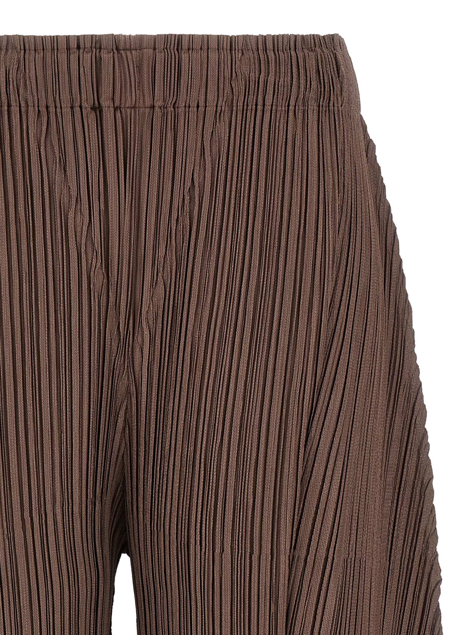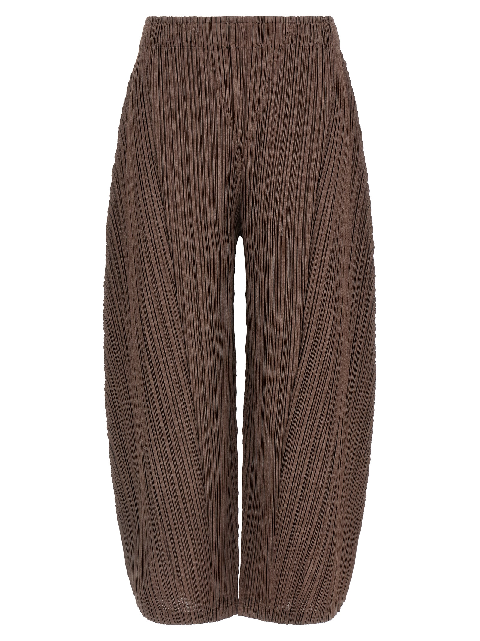 'Thicker Bottoms 2' pleated fabric trousers, barrel silhouette, elastic waistband, pockets, split on the leg bottom, characterized by central pleats and a partial diagonal pleating created by folding the garment before subjecting it to the pleating process.