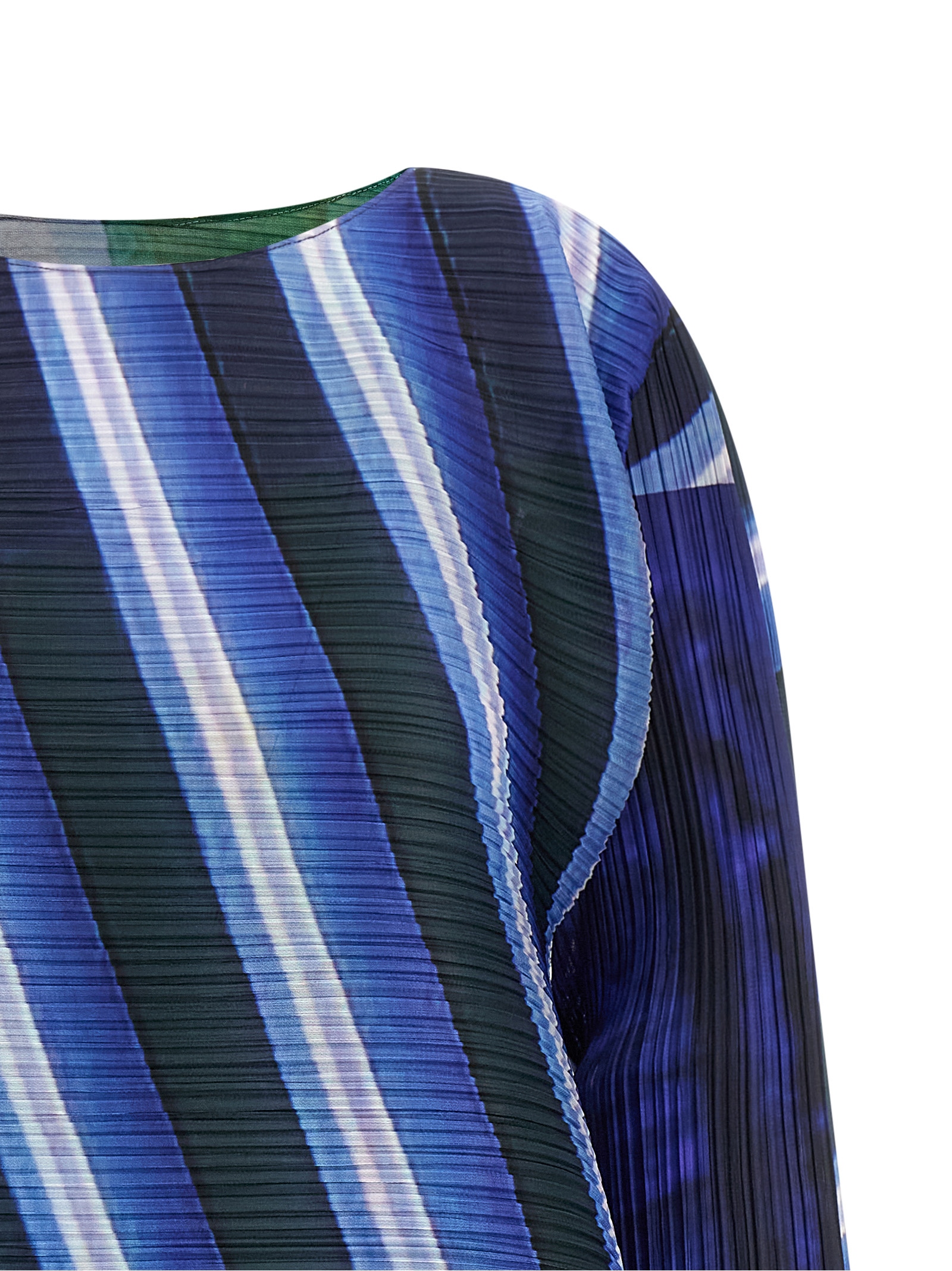 Pleated midi dress with all-over 'City Collage' graphic print, sculptural skirt, boat neck, long sleeves.