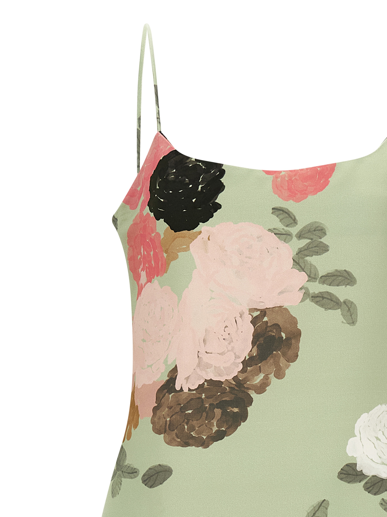 Nicole' long dress in sturdy fabric with an Auscot Rose print satin silk feel, flared silhouette with wide skirt, wide neckline at the front and back, thin straps, side zip closure, pockets, lining.