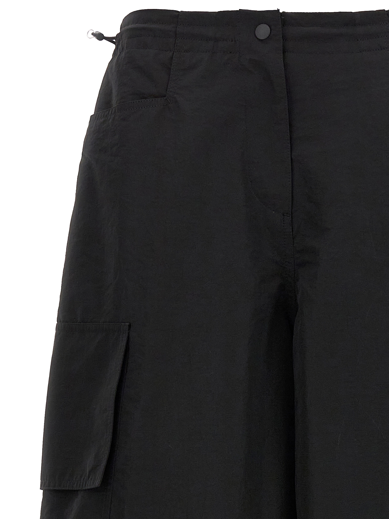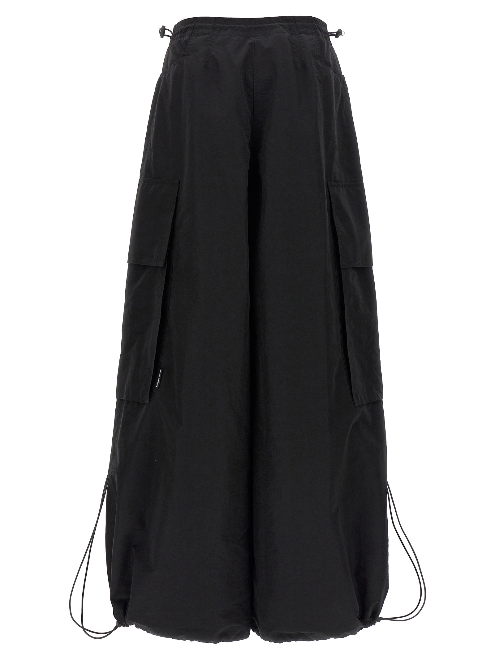 Parachute pants in nylon with zipper and button closure, adjustable elastic drawstring at the waist, pockets, and adjustable elastic cuffs with drawstring.