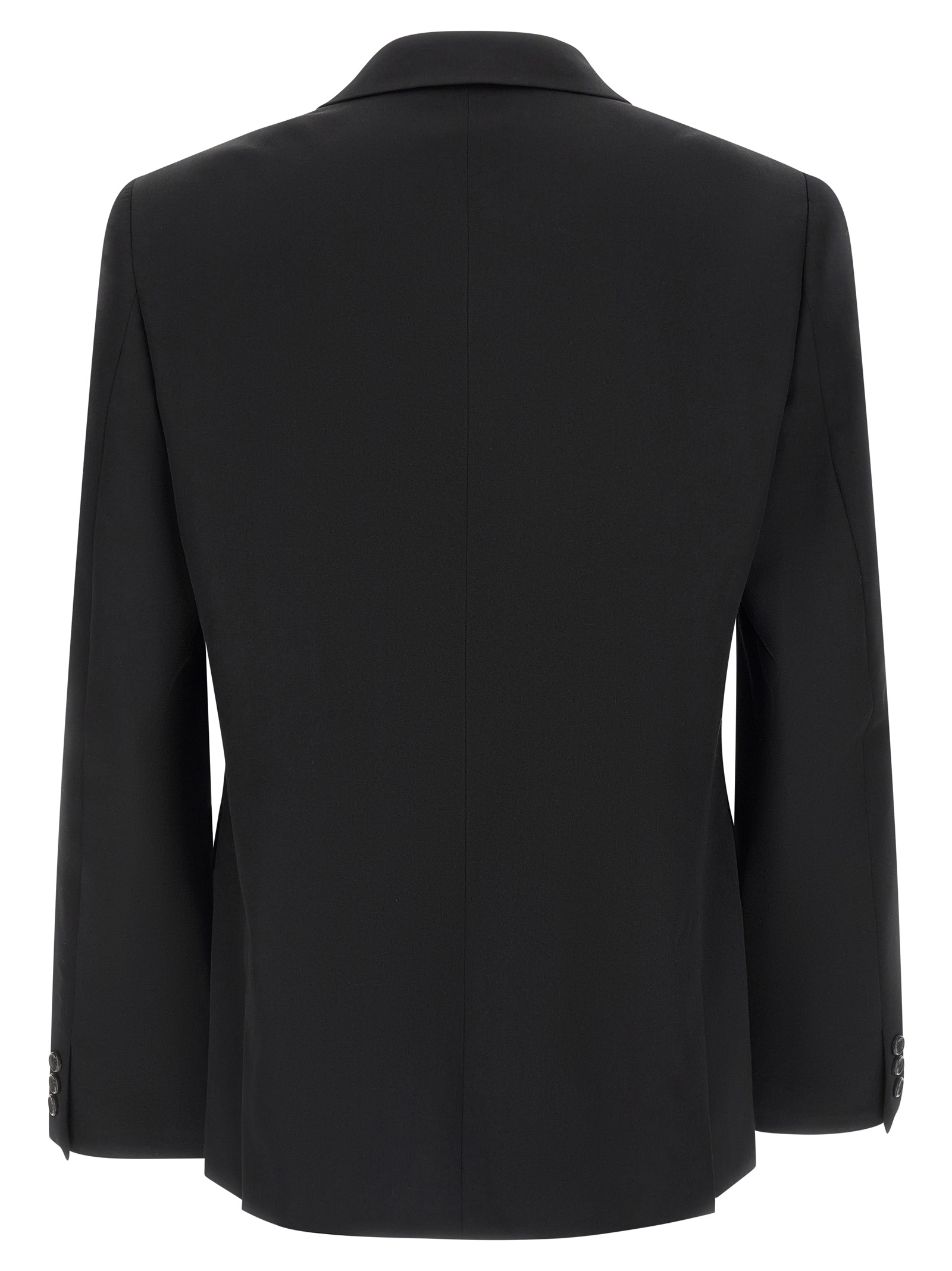 Double-breasted wool blazer with front horn closure, peak lapels, chest pocket, flap pockets, padded shoulder straps, cuffs with non-opening buttonholes, back vents, cupro lining, and two inside pockets.