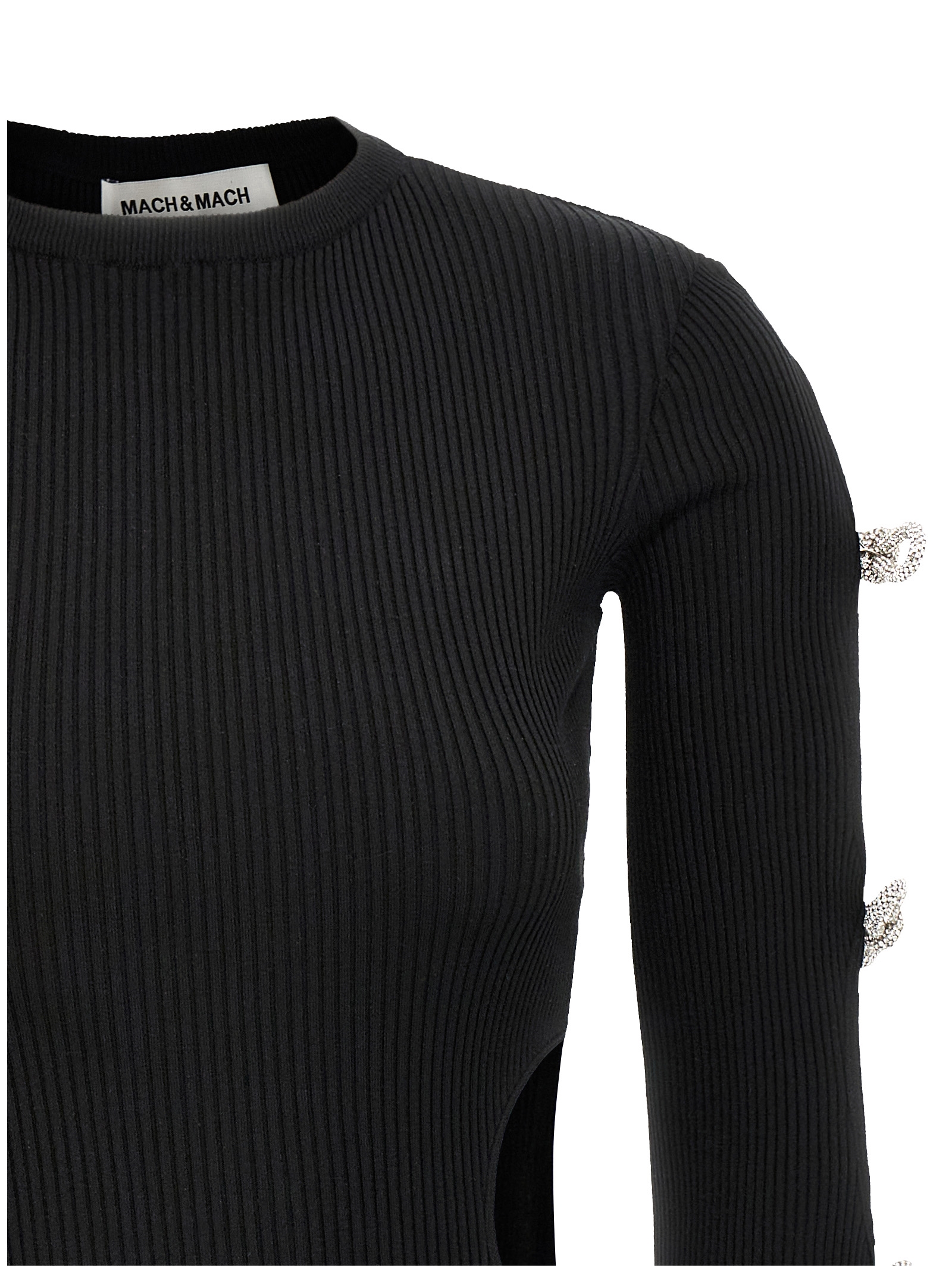 'Cut-Out Crystal Bow' mini dress in stretch viscose blend with all-over cut-out details, crew neck, long sleeves with rhinestone bow decoration.