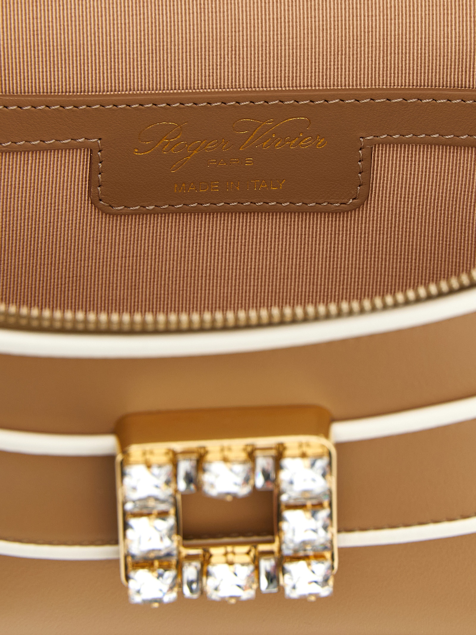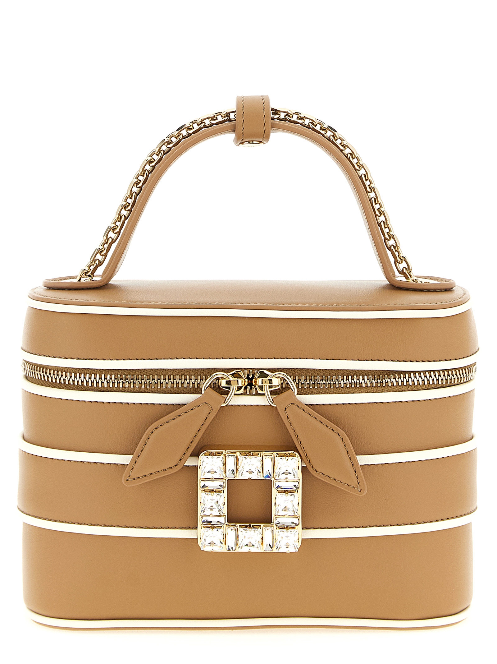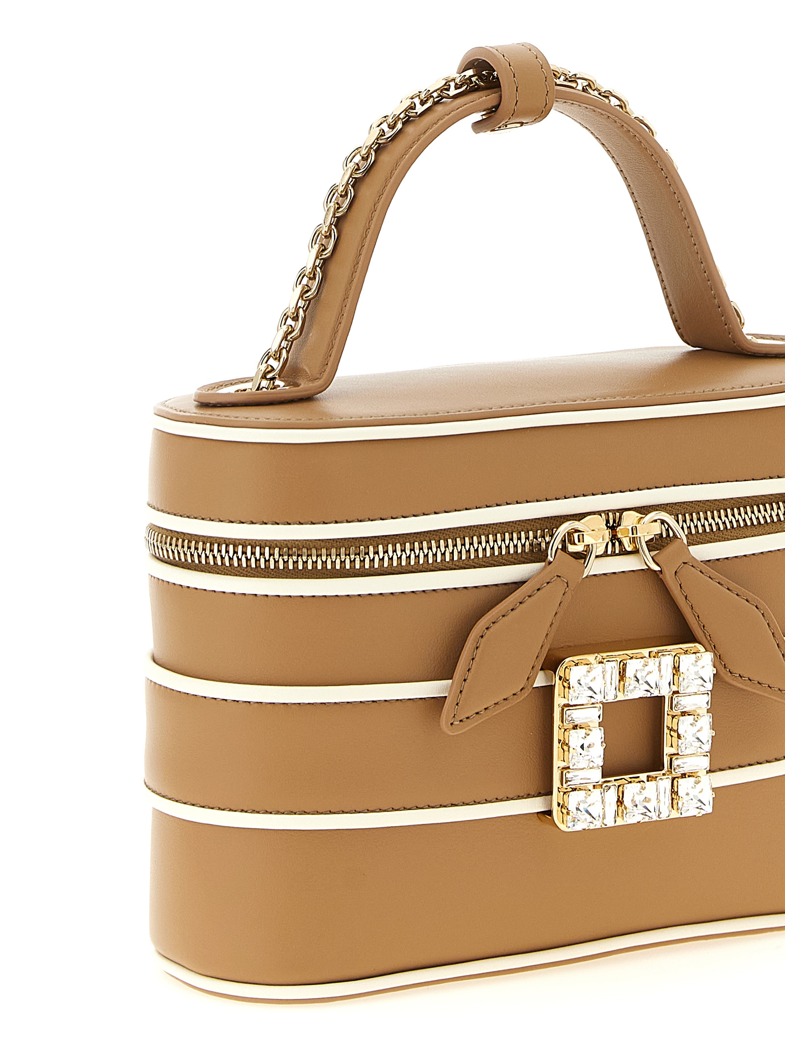 'Micro Vanity Très Vivier' leather handbag with contrasting details, metal 'Très Vivier' buckle with front square crystals, fixed handle, zip closure, sliding chain shoulder strap, fabric lining.