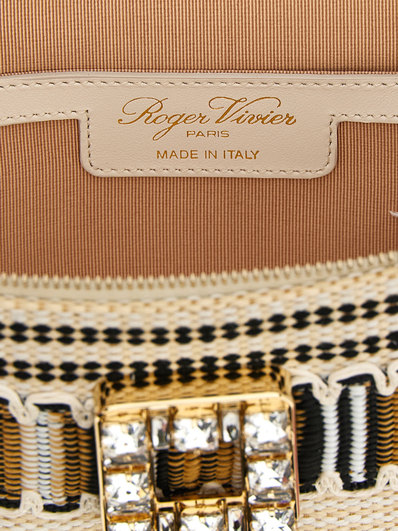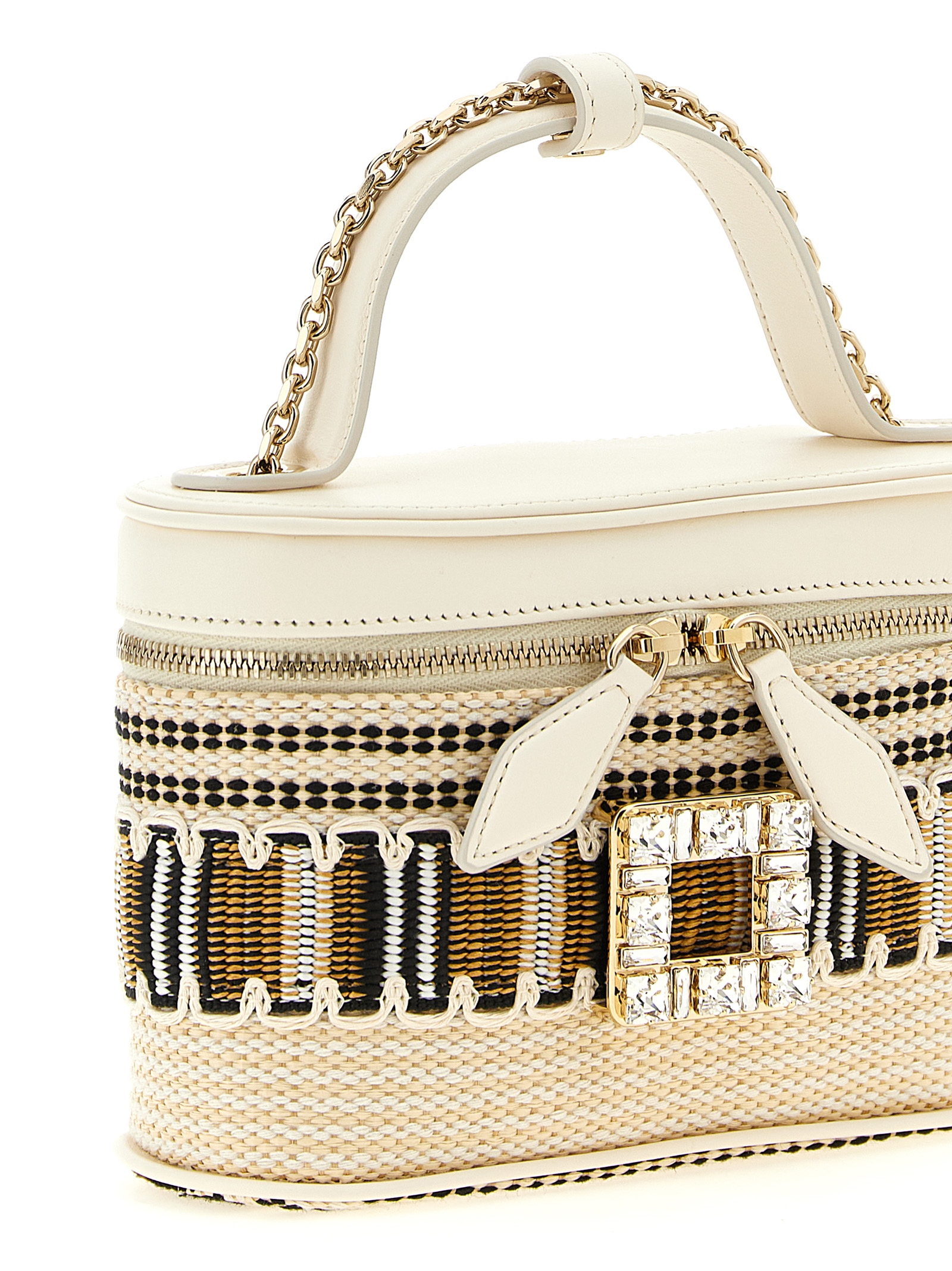 Micro 'Vanity Très Vivier' handbag in woven raffia with geometric patterns and smooth leather details, metal 'Très Vivier' buckle with front square crystals, fixed handle, zip closure, sliding chain shoulder strap, fabric lining.